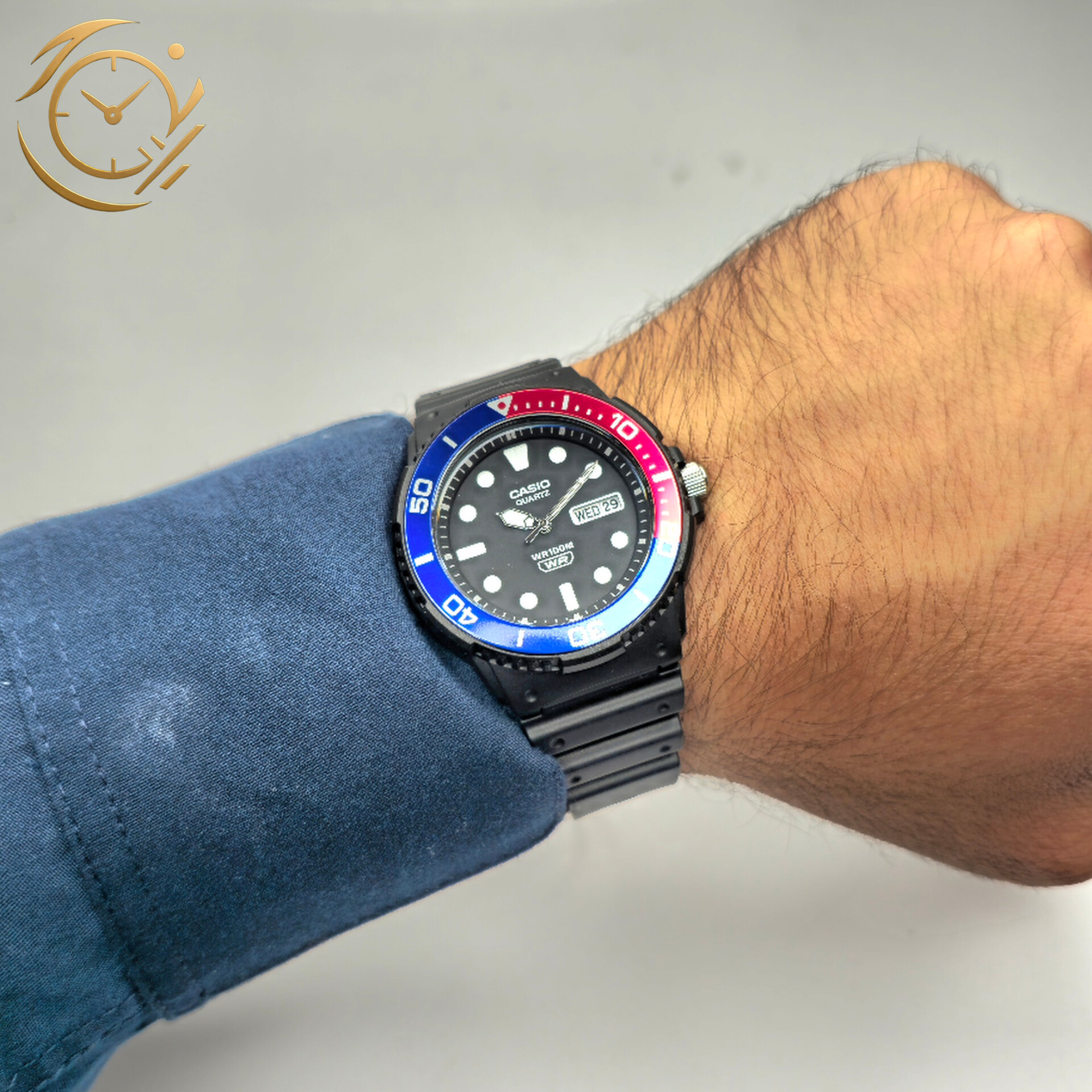ساعت مچی مردانه Casio مدل MRW-230H-1E3VDF گزینهای مناسب برای آقایانی است که بهدنبال یک ساعت اسپرت، مقاوم و کاربردی برای استفاده روزمره هستند. ترکیب صفحه مشکی با قاب آبی–قرمز ظاهری جذاب و متفاوت به این مدل داده که بهخوبی با استایلهای اسپرت و کژوال هماهنگ میشود.این ساعت به موتور کوارتز دقیق کاسیو مجهز است و با مقاومت در برابر آب تا 100 متر، خیال شما را در استفادههای روزانه، شستوشوی دست و حتی شناهای سطحی راحت میکند. بند رزینی مشکی علاوهبر وزن سبک، دوام بالایی دارد و برای استفاده طولانیمدت کاملاً راحت است.نمایش تاریخ و روز هفته، خوانایی مناسب صفحه و قاب چرخان اسپرت، MRW-230H-1E3VDF را به انتخابی مطمئن برای فعالیتهای روزمره و ورزشی تبدیل کرده است. اگر بهدنبال کیفیت ژاپنی، طراحی چشمگیر و دوام بالا هستید، این مدل از Casio میتواند انتخابی هوشمندانه باشد.