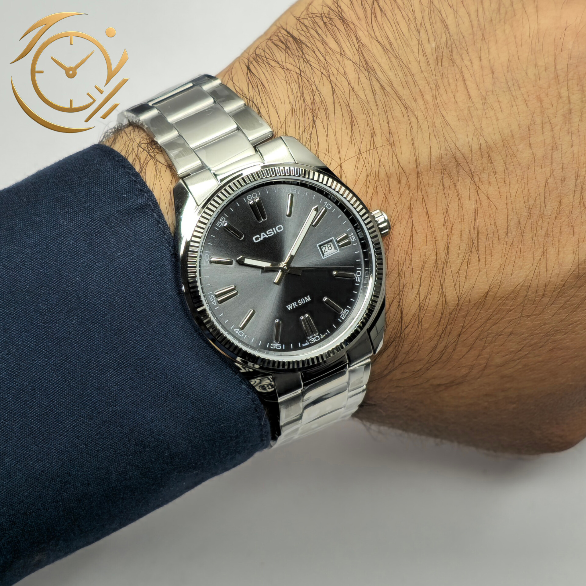 ساعت مچی مردانه Casio مدل MTP-1302D-1A1 یکی از مدلهای شیک و محبوب برند کاسیو است که با ترکیب صفحه مشکی و بند استیل نقرهای، استایلی رسمی و چشمنواز خلق کرده است. این ساعت با طراحی کلاسیک و جزئیات دقیقش، انتخابی عالی برای آقایانی است که به ظاهر آراسته و مینیمال اهمیت میدهند.صفحه مشکی براق در کنار نشانگرهای نقرهای و قاب صیقلی، جلوهای لوکس و در عین حال متین به ساعت میبخشد. بند استیل ضدزنگ، حس استحکام و اعتماد را منتقل میکند و با فرم باریک بدنه، روی مچ بهصورت بسیار راحت و متعادل قرار میگیرد. این ترکیب رنگ و طراحی باعث شده تا مدل MTP-1302D-1A1 هم برای جلسات رسمی و کاری مناسب باشد و هم برای استفاده روزمره ظاهری شیک و ماندگار ایجاد کند.کاسیو در این مدل، تعادلی مثالزدنی بین دوام، سادگی و ظرافت برقرار کرده است؛ ساعتی که بهخوبی میتواند تکمیلکننده تیپ رسمی، کتوشلوار تیره یا لباسهای نیمهرسمی شما باشد. اگر به دنبال ساعتی هستید که در عین سادگی، جذابیت خاصی داشته باشد و تا سالها از مد نیفتد،Casio MTP-1302D-1A1 انتخابی بینقص است.