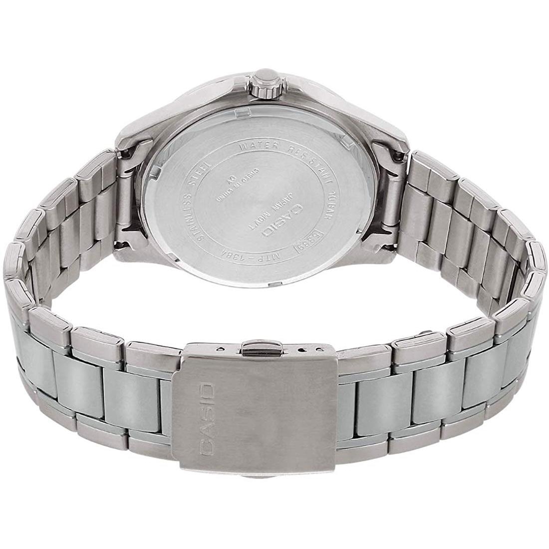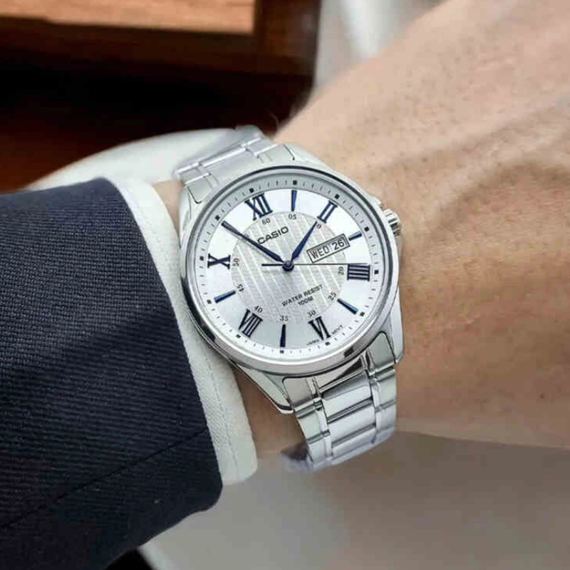 ساعت مچی مردانه Casio MTP-1384D-7A2 با صفحه سفید کلاسیک و بند استیل نقرهای، ترکیبی از طراحی شیک، کیفیت بالا و دوام طولانی ارائه میدهد. طراحی مینیمال و تمیز صفحه با شاخصهای واضح، خوانایی عالی زمان را فراهم کرده و این مدل را برای استفاده روزمره، محیط کار و استایلهای رسمی و نیمهرسمی مناسب میکند.این مدل مجهز به موتور کوارتز دقیق و کممصرف است که زمانسنجی پایدار و عملکرد قابل اعتماد را تضمین میکند. شیشه معدنی مقاوم، صفحه را در برابر خطوخشهای معمول محافظت میکند و قاب و بند استیل با کیفیت بالا، دوام طولانی و استحکام کافی برای استفاده روزانه ایجاد میکند. مقاومت در برابر پاشش آب، امکان استفاده راحت و بدون نگرانی در فعالیتهای روزمره را فراهم میکند.اگر به دنبال یک ساعت مردانه خوشساخت، شیک، کلاسیک و با قیمت مناسب هستید، MTP-1384D-7A2 یکی از بهترین گزینههای کاسیو برای استایل رسمی، روزمره و نیمهرسمی محسوب میشود.