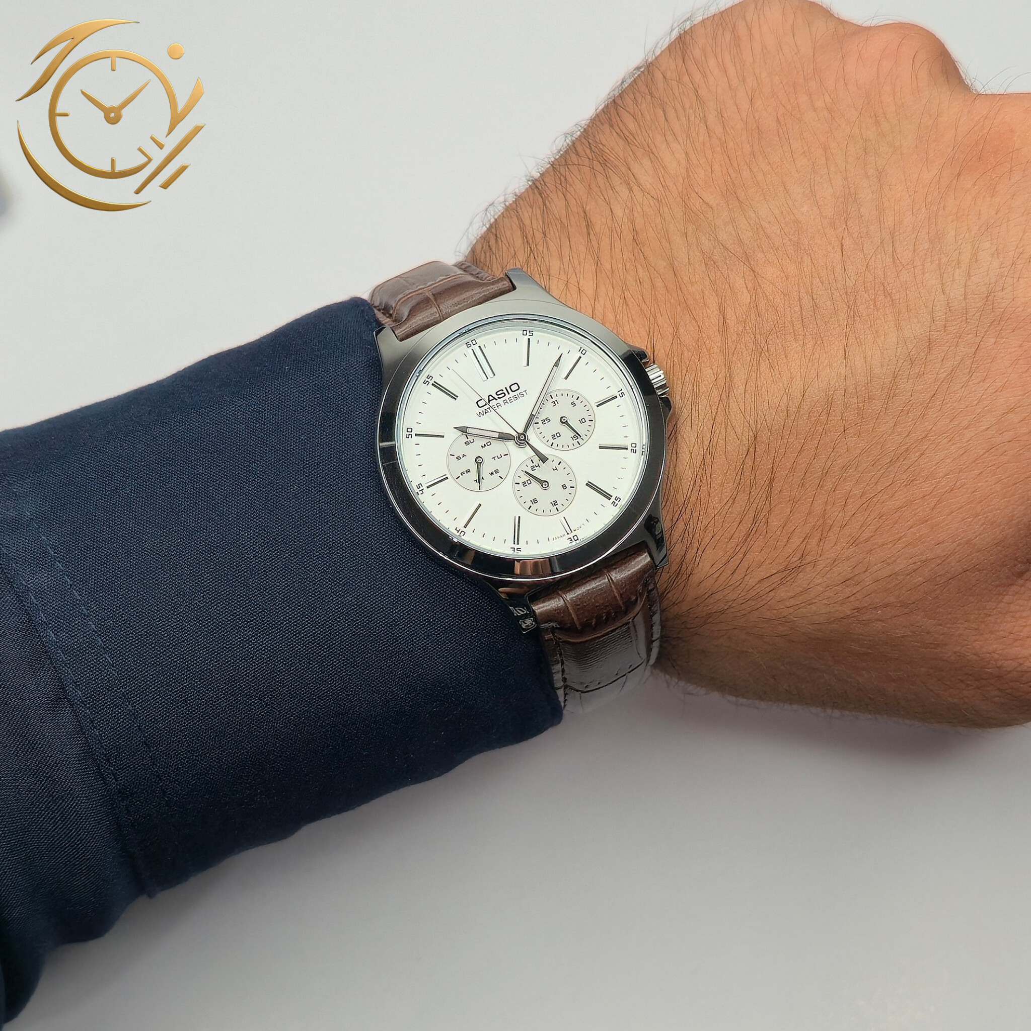 ساعت مچی مردانه Casio مدل MTP-V300L-7A ترکیبی زیبا از طراحی کلاسیک و ظرافت مدرن است. این مدل با بند چرمی قهوهای و صفحه سفید ساده، جلوهای مینیمال و در عین حال شیک دارد که بهخوبی با استایل رسمی یا روزمره هماهنگ میشود. ظاهر تمیز و متعادل ساعت باعث میشود در هر موقعیتی – از جلسات کاری تا قرارهای روزانه – ظاهری آراسته و حرفهای داشته باشید.صفحه سفید با سه زیرصفحه ظریف طراحی شده که حس عملکرد و دقت را به ساعت میدهد، در حالی که رنگ گرم بند چرمی قهوهای حس کلاسیک و اصالت را تقویت میکند. این ترکیب رنگ، ظاهری لوکس اما صمیمی ایجاد کرده که برای آقایان خوشپوش انتخابی ایدهآل است.کاسیو در مدل MTP-V300L-7A نشان داده که چطور میتوان بین سادگی و کاربرد تعادل برقرار کرد. بدنه باریک، طراحی خوشدست و جزئیات دقیق ساخت، همگی نشان از کیفیت اصیل برند کاسیو دارند. اگر به دنبال ساعتی هستید که در عین سادگی، جلوهای خاص و حرفهای به استایل شما ببخشد، این مدل یکی از بهترین گزینهها برایتان خواهد بود.