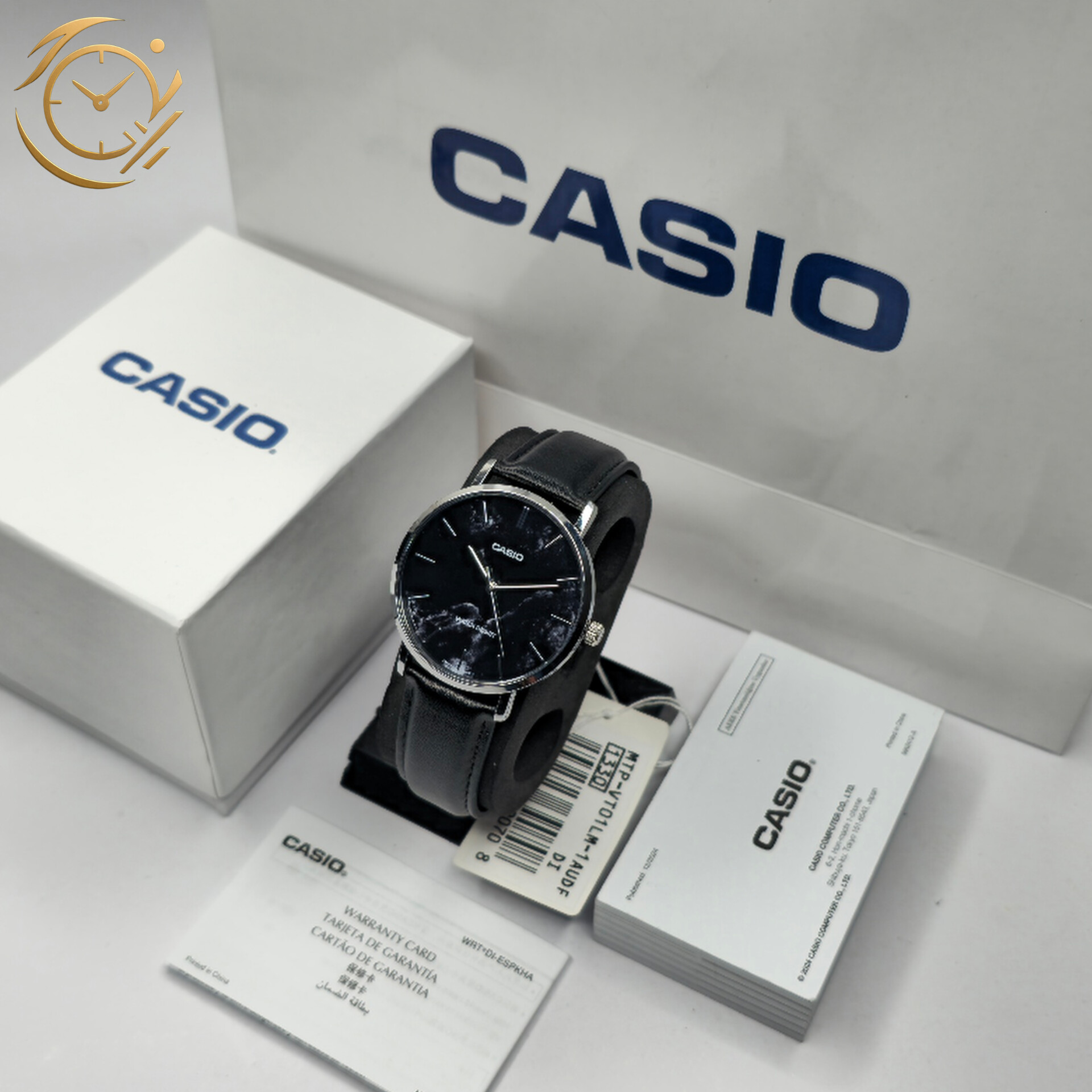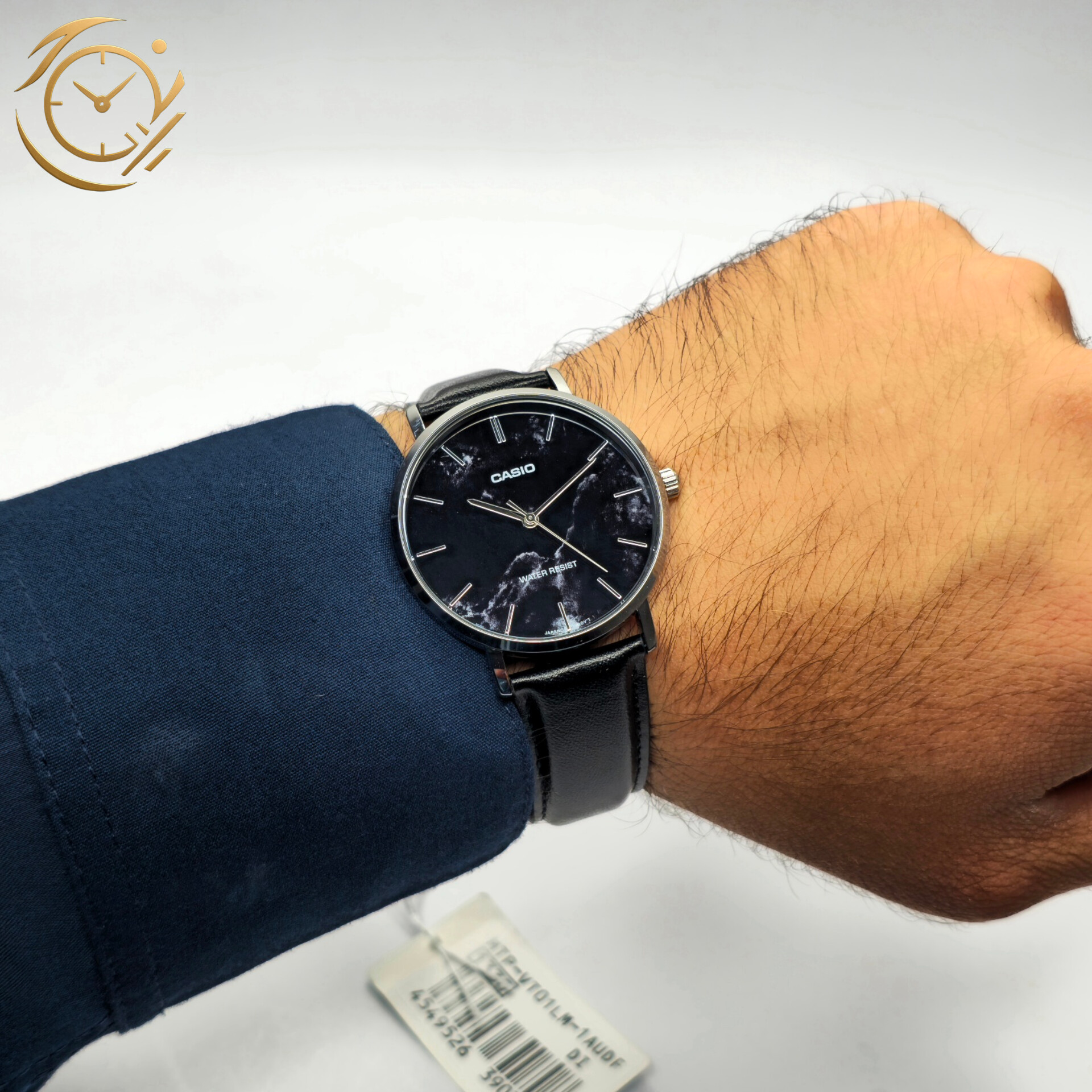 ساعت مچی مردانه Casio MTP-VT01LM-1AUDF با صفحه مشکی کلاسیک و بند چرمی مشکی، ترکیبی از طراحی شیک، دوام بالا و کیفیت ساخت قابل اعتماد را ارائه میدهد. طراحی مینیمال و تمیز صفحه با شاخصهای واضح، خوانایی عالی زمان را تضمین کرده و این مدل را به انتخابی مناسب برای استفاده روزمره، محیط کار و استایلهای رسمی و نیمهرسمی تبدیل میکند.این ساعت مجهز به موتور کوارتز دقیق و کممصرف است که زمانسنجی پایدار و عملکرد قابل اعتماد را فراهم میکند. شیشه معدنی مقاوم، صفحه را در برابر خطوخشهای معمول محافظت میکند و قاب و بند چرمی با کیفیت بالا، دوام طولانی و راحتی برای استفاده روزانه ایجاد میکند. مقاومت در برابر پاشش آب، امکان استفاده راحت و بدون نگرانی در فعالیتهای روزمره را فراهم میآورد.اگر به دنبال یک ساعت مردانه خوشساخت، شیک، کلاسیک و با قیمت مناسب هستید، MTP-VT01LM-1AUDF یکی از بهترین انتخابهای کاسیو برای استایل روزمره، رسمی و نیمهرسمی محسوب میشود.