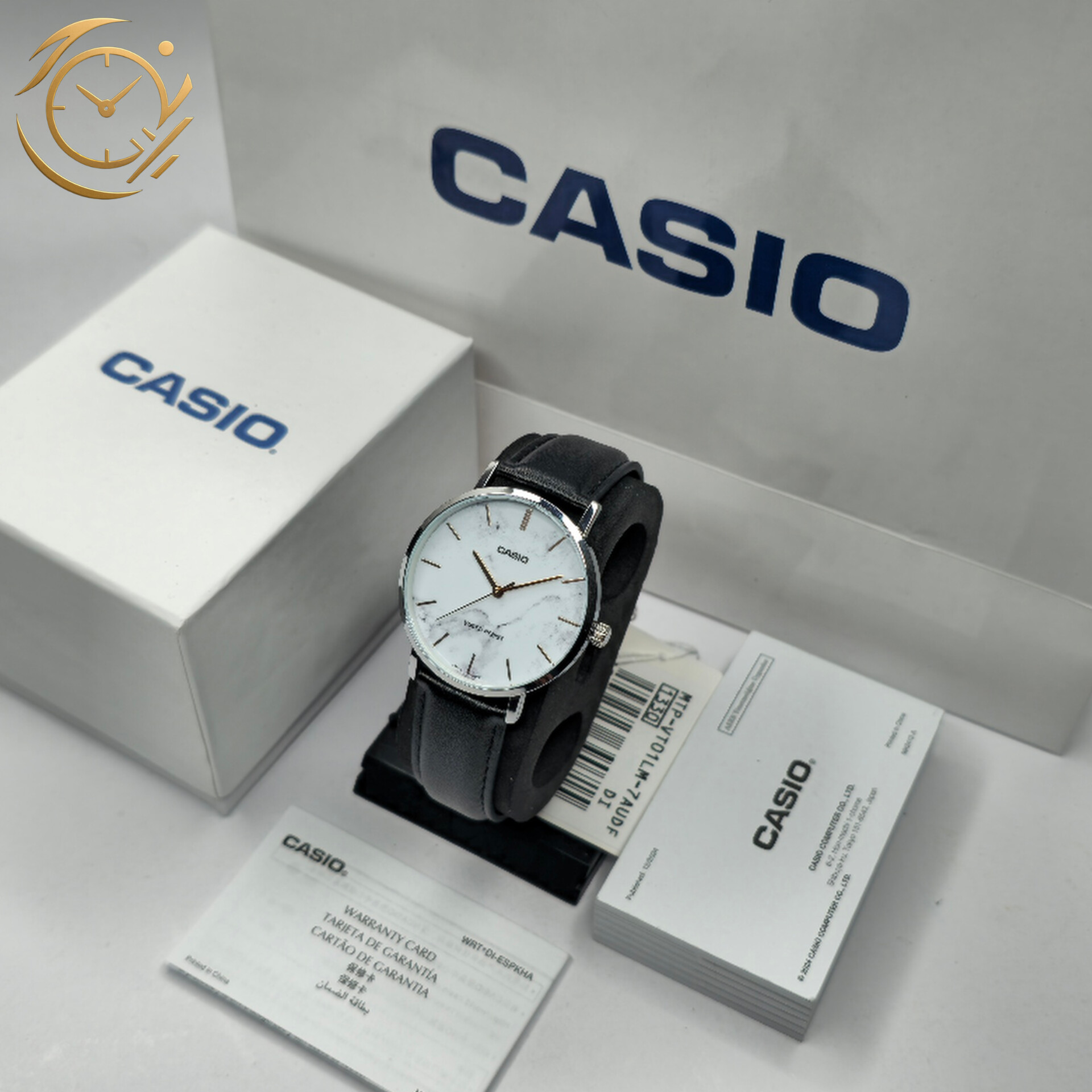 ساعت مچی مردانه Casio MTP-VT01LM-7AUDF با صفحه سفید کلاسیک و بند چرمی مشکی، ترکیبی از طراحی شیک، کیفیت بالا و دوام طولانی ارائه میدهد. طراحی مینیمال و تمیز صفحه با شاخصهای واضح، خوانایی عالی زمان را فراهم کرده و این مدل را برای استفاده روزمره، محیط کار و استایلهای رسمی و نیمهرسمی مناسب میکند.این ساعت مجهز به موتور کوارتز دقیق و کممصرف است که زمانسنجی پایدار و عملکرد قابل اعتماد را تضمین میکند. شیشه معدنی مقاوم، صفحه را در برابر خطوخشهای معمول محافظت میکند و قاب و بند چرمی با کیفیت بالا، دوام طولانی و راحتی بالا برای استفاده روزانه ایجاد میکند. مقاومت در برابر پاشش آب، امکان استفاده آسان و بدون نگرانی در فعالیتهای روزمره را فراهم میآورد.اگر به دنبال یک ساعت مردانه خوشساخت، شیک، کلاسیک و با قیمت مناسب هستید، MTP-VT01LM-7AUDF یکی از بهترین انتخابهای کاسیو برای استایل روزمره، رسمی و نیمهرسمی محسوب میشود.