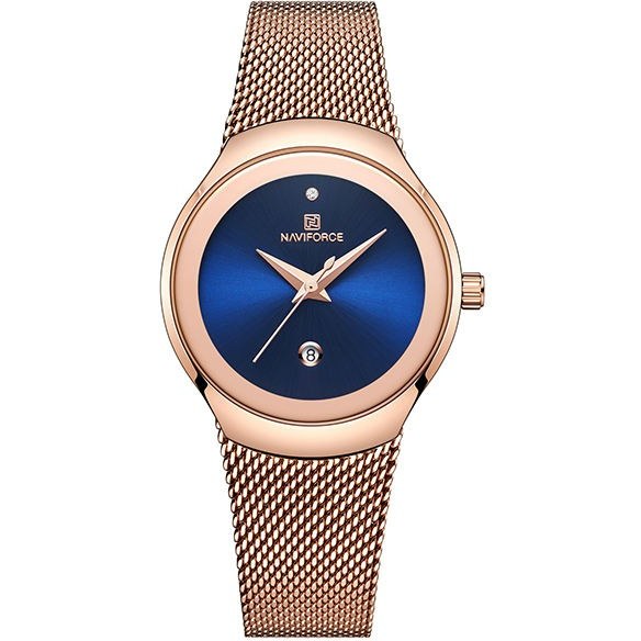 ساعت مچی زنانه Naviforce مدل NF5004 | بند حصیری رزگلد، صفحه آبی| مینیمال و نمایش تاریخ