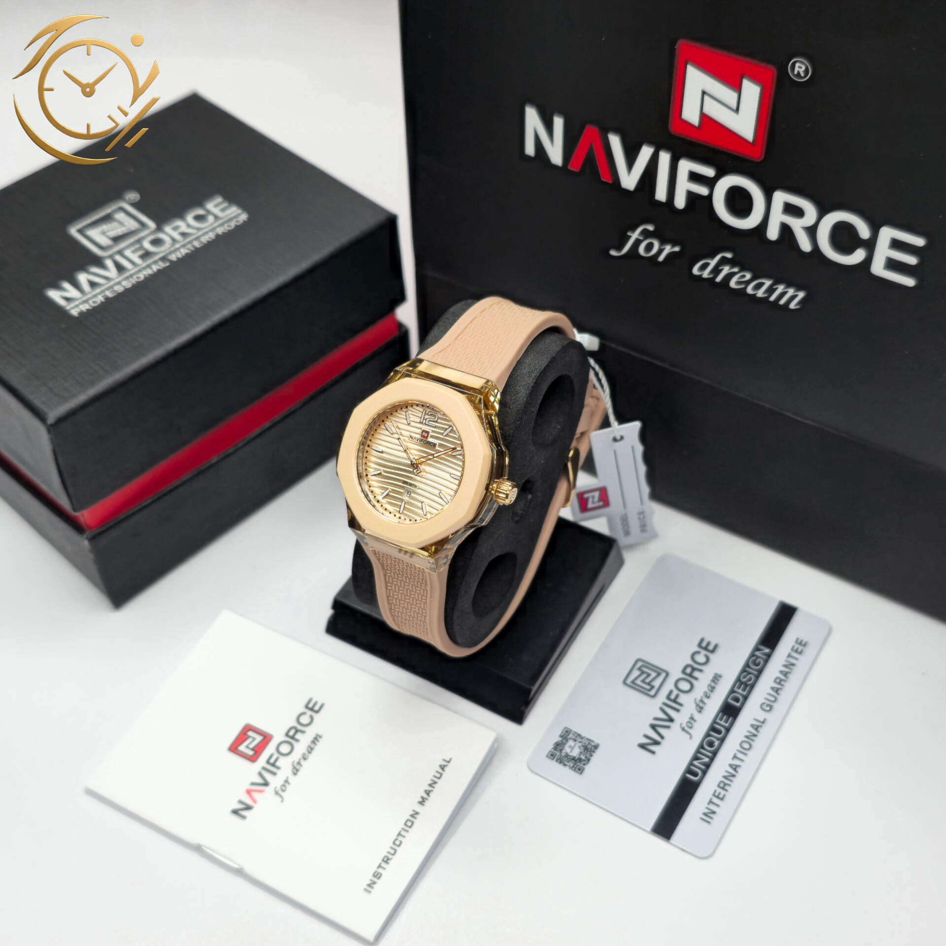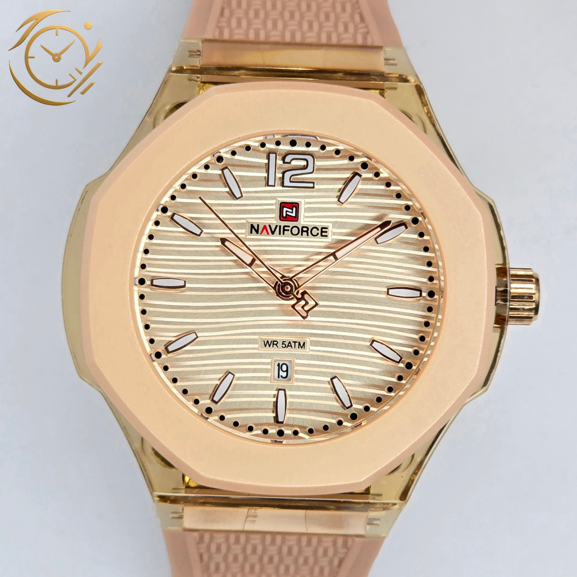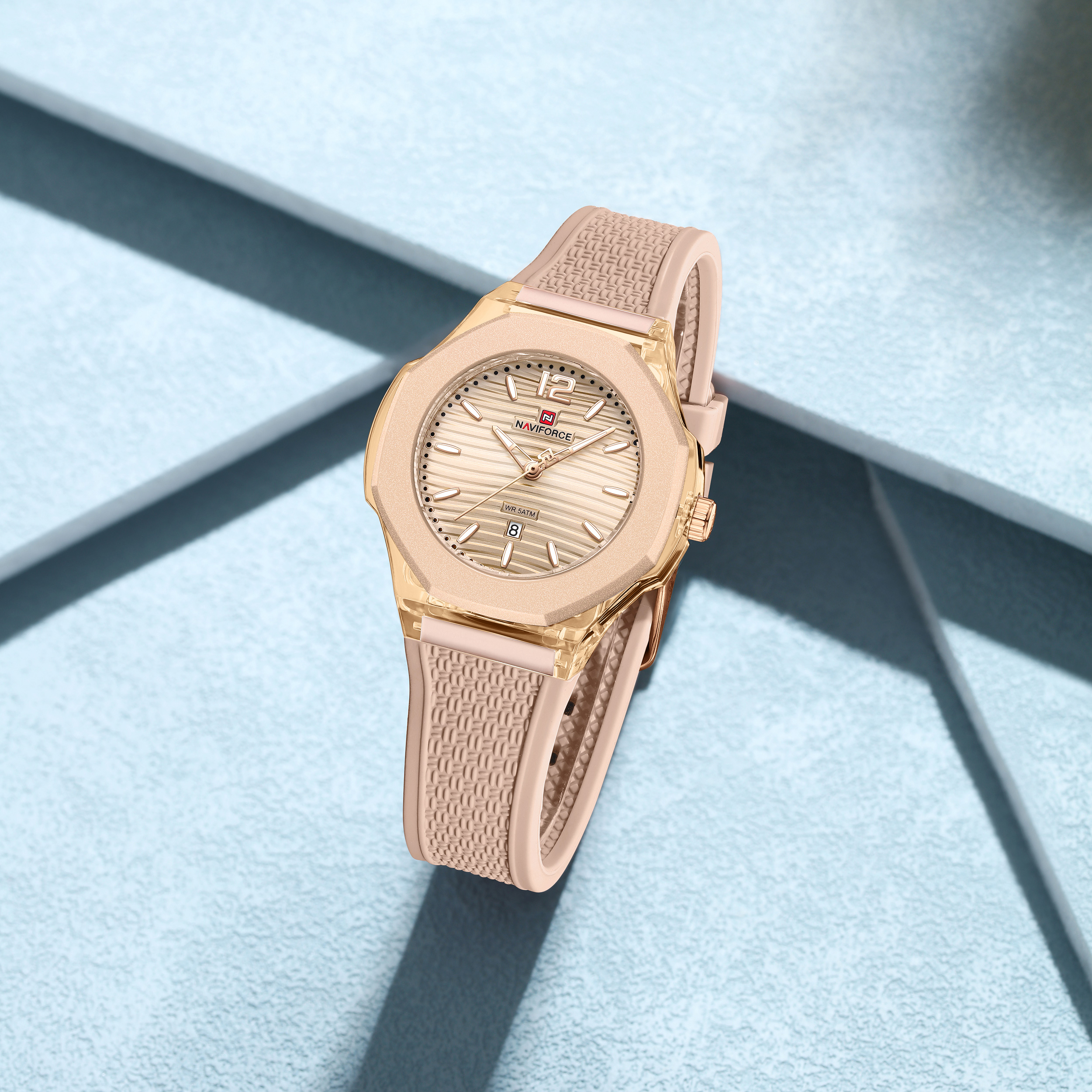 ساعت مچی زنانه Naviforce مدل NF6109 انتخابی شیک و اسپرت برای خانمهایی است که به طراحی جذاب و لوکس علاقه دارند. صفحه رزگلد هماهنگ با بند سیلیکونی رزگلد، ظاهری مدرن، زنانه و چشمنواز ایجاد میکند که بهراحتی با استایلهای روزمره، کژوال و حتی مهمانی ست میشود.این مدل به موتور کوارتز دقیق Naviforce مجهز شده و عملکردی قابلاعتماد برای استفادهی روزانه ارائه میدهد. بند سیلیکونی نرم و سبک، راحتی و آزادی حرکت بالایی فراهم میکند و برای فعالیتهای طولانیمدت یا ورزشهای سبک مناسب است. صفحه رزگلد با نشانگرهای واضح، خوانایی بالایی در هر شرایط نوری دارد.اگر بهدنبال ساعتی زنانه، اسپرت و باکیفیت هستید که استایل شما را تکمیل کرده و جلوهای خاص بدهد، Naviforce NF6109 انتخابی هوشمندانه و جذاب خواهد بود.