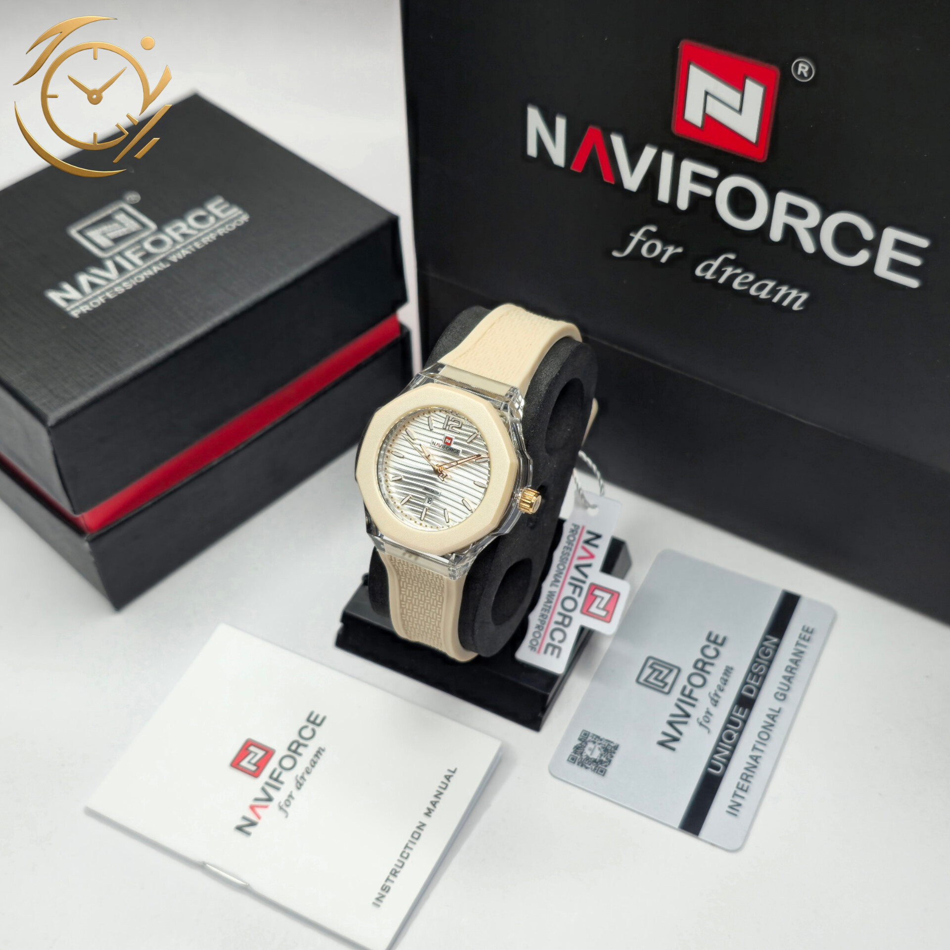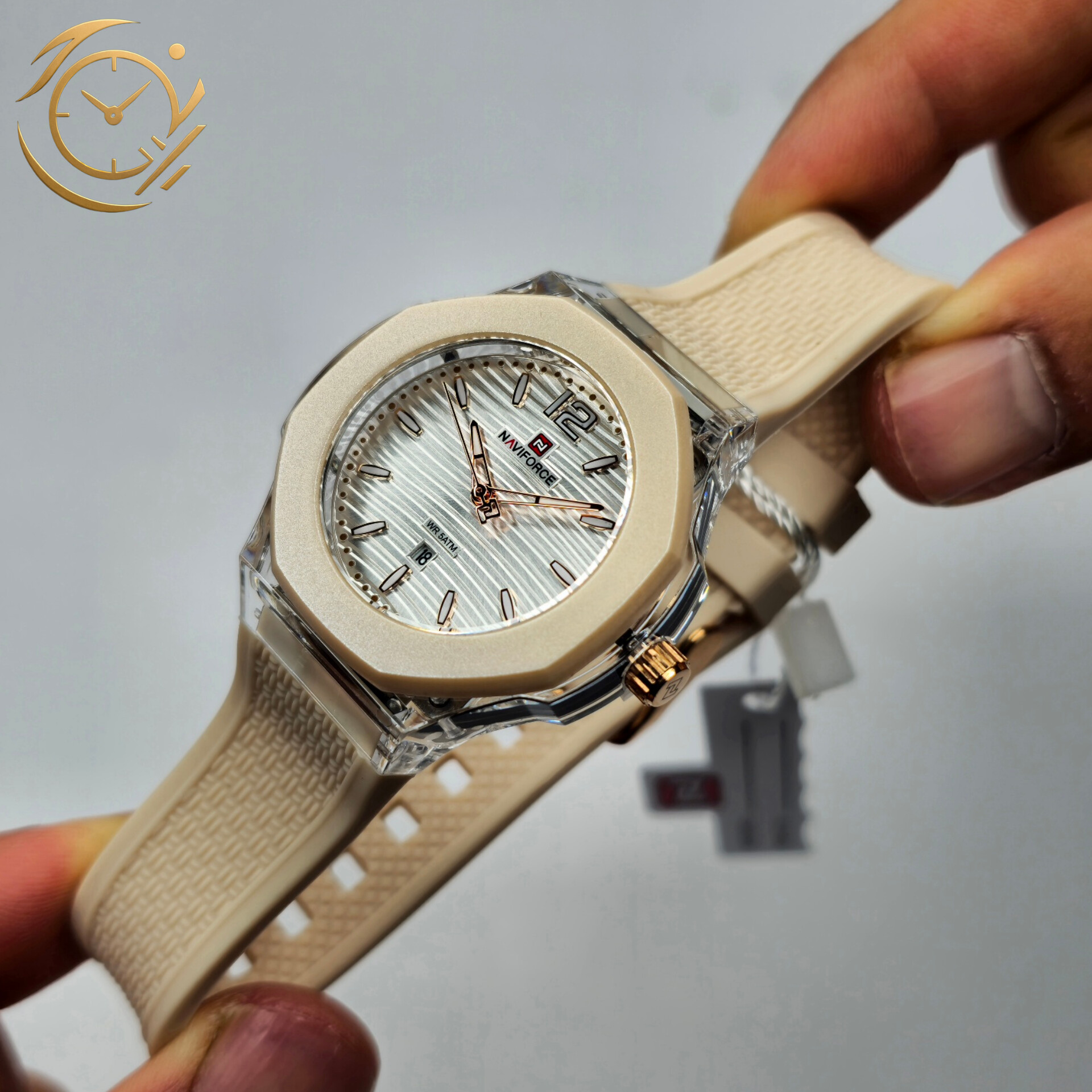 ساعت مچی زنانه Naviforce مدل NF6109 انتخابی اسپرت و شیک برای خانمهایی است که به طراحی ملایم و روزمره اهمیت میدهند. صفحه سفید در هماهنگی با بند سیلیکونی کرم ظاهری لطیف، مدرن و مناسب استایل روزمره و کژوال ایجاد میکند.این مدل به موتور کوارتز دقیق Naviforce مجهز شده و عملکردی قابلاعتماد برای استفادهی روزانه ارائه میدهد. بند سیلیکونی نرم و سبک، راحتی و آزادی حرکت بالایی فراهم میکند و مناسب استفاده طولانی یا فعالیتهای سبک ورزشی است. صفحه سفید با نشانگرهای واضح، خوانایی مناسبی در هر شرایط نوری دارد.اگر بهدنبال ساعتی زنانه، اسپرت و باکیفیت هستید که استایل روزمره شما را تکمیل کند، Naviforce NF6109 انتخابی هوشمندانه و چشمنواز خواهد بود.