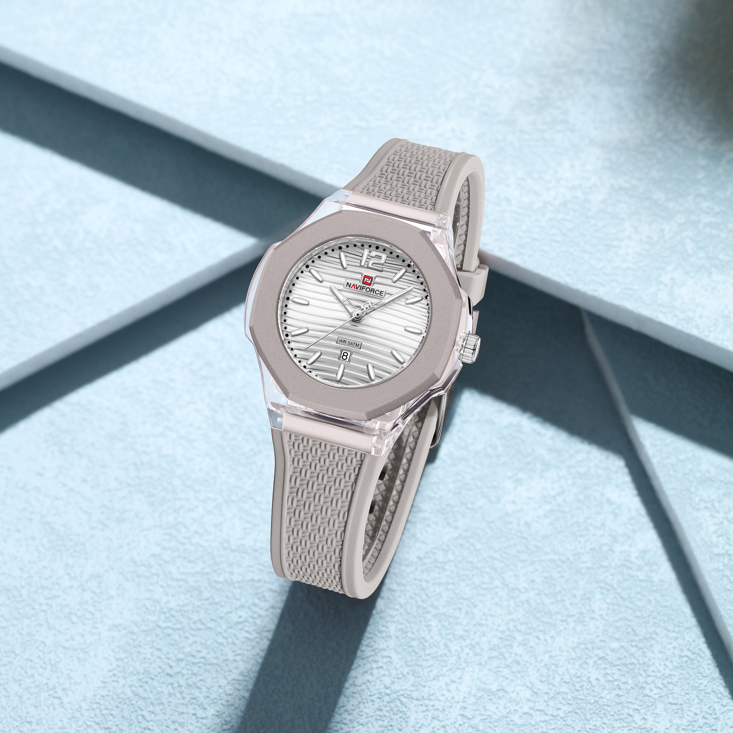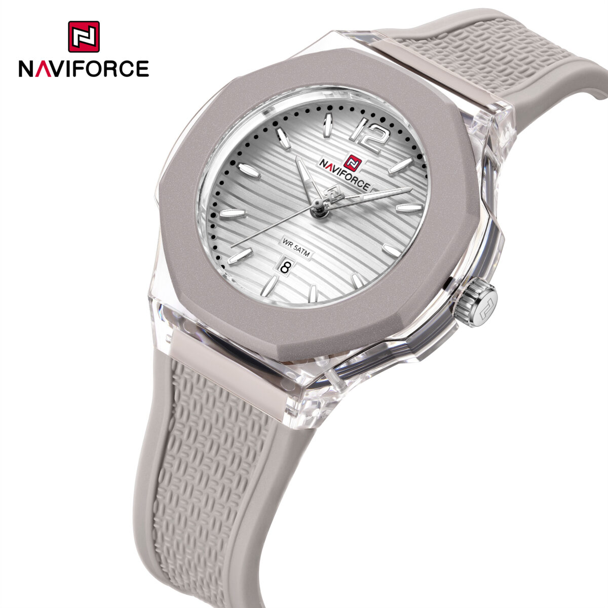 ساعت مچی زنانه Naviforce مدل NF6109 انتخابی اسپرت و شیک برای خانمهایی است که به طراحی روزمره و مینیمال علاقه دارند. صفحه سفید در کنار بند سیلیکونی خاکستری ظاهری مدرن، ساده و هماهنگ با انواع استایلهای کژوال و اسپرت ایجاد میکند.این مدل به موتور کوارتز دقیق Naviforce مجهز است و عملکردی قابلاعتماد در استفاده روزانه ارائه میدهد. بند سیلیکونی نرم و سبک، راحتی و آزادی حرکت بالایی فراهم میکند و برای فعالیتهای طولانی یا ورزشهای سبک مناسب است. صفحه سفید با عقربهها و نشانگرهای واضح، خوانایی عالی در هر شرایط نوری دارد.اگر بهدنبال ساعتی زنانه، اسپرت و باکیفیت هستید که استایل روزمرهتان را تکمیل کند، Naviforce NF6109 انتخابی هوشمندانه و چشمنواز خواهد بود.