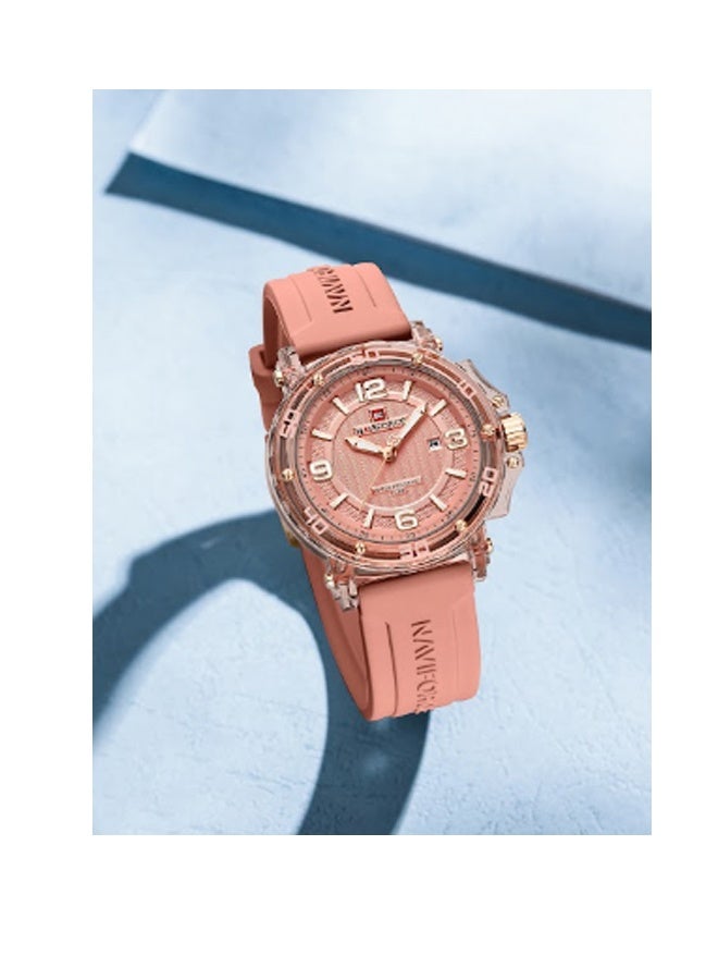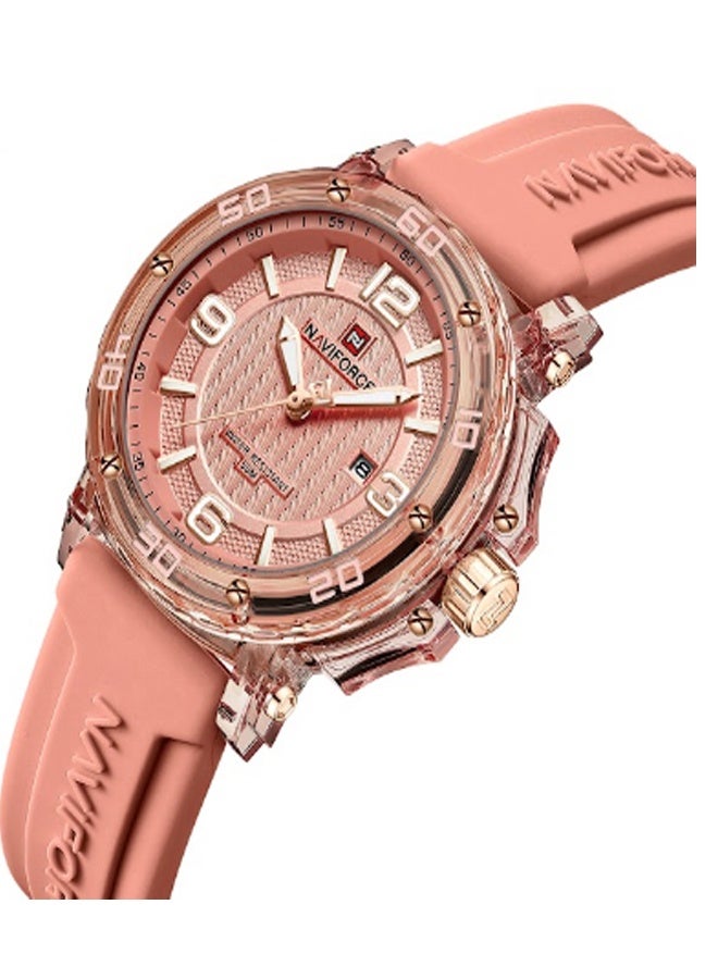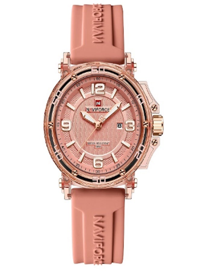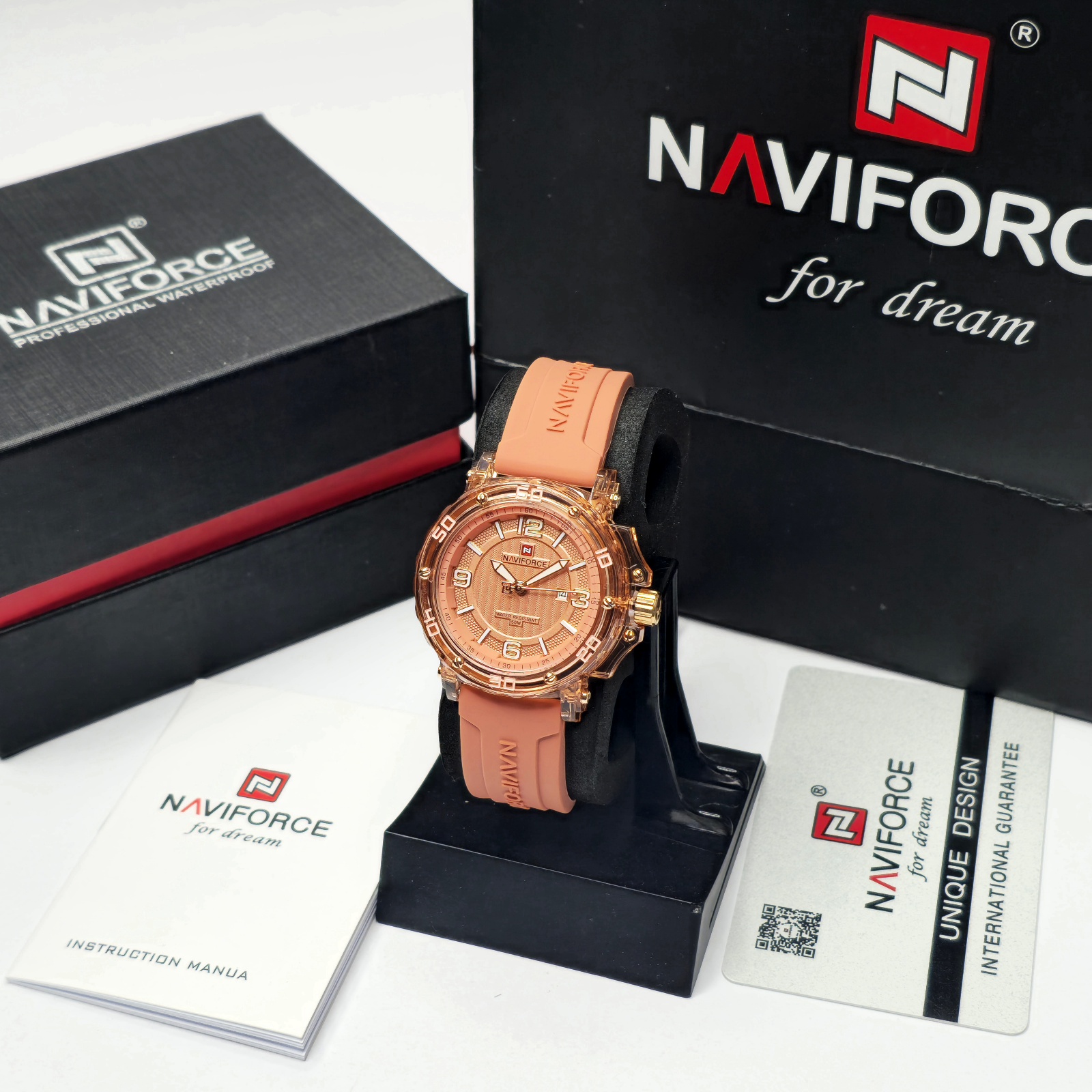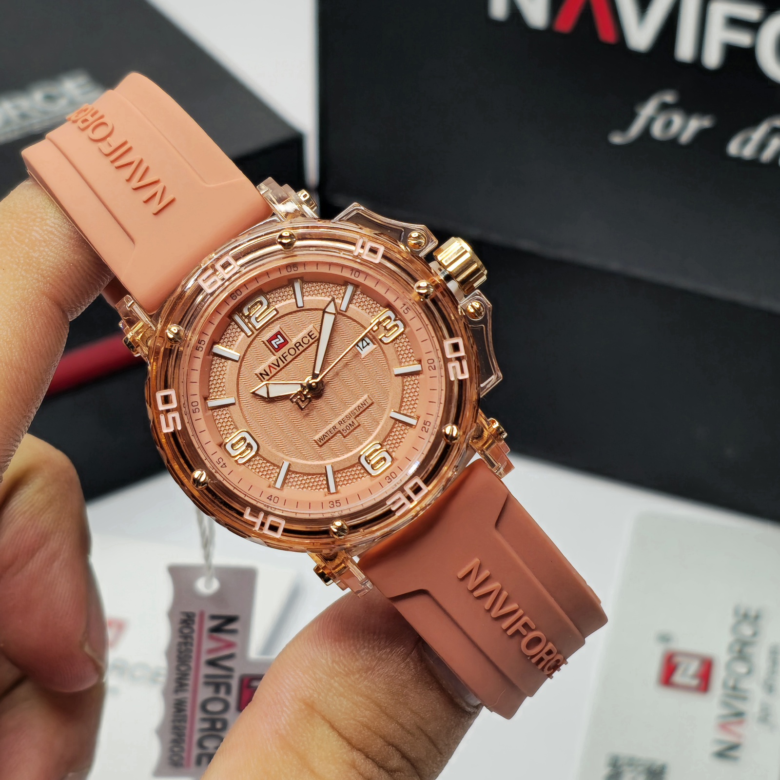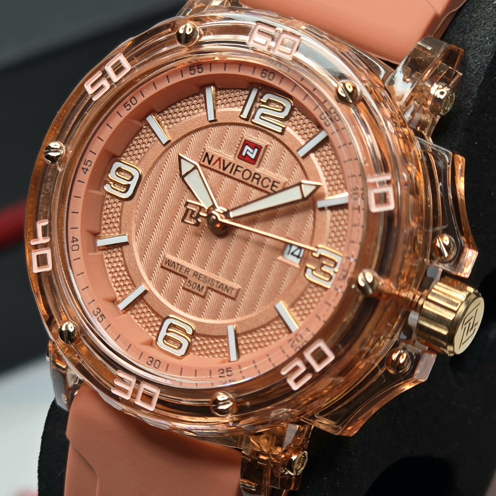 ساعت مچی زنانه Naviforce مدل NF7125 با ترکیب رنگ صورتی ملایم و طراحی اسپرت، انتخابی ایدهآل برای خانمهایی است که بهدنبال ساعتی لطیف، مدرن و متفاوت هستند. بند سیلیکونی صورتیرنگ این مدل علاوه بر ظاهر جذاب، بسیار سبک و راحت است و استفاده طولانیمدت از آن را دلپذیر میکند.صفحه صورتی با جزئیات طلایی، جلوهای زنانه و چشمنواز ایجاد کرده و موتور کوارتز با دقت بالا تضمین میکند که زمان همیشه دقیق و منظم پیش برود. مقاومت در برابر آب تا عمق ۵۰ متر، نمایشگر تاریخ و عقربههای شبتاب از دیگر ویژگیهای کاربردی این ساعت هستند.اگر بهدنبال ساعتی هستید که همزمان شیک، اسپرت و جوانپسند باشد، Naviforce NF7125 رنگ صورتی انتخابی عالی برای استایل روزمره یا تیپهای اسپرت شما خواهد بود؛ ساعتی که جذابیت و انرژی مثبت را روی مچ دستانتان به نمایش میگذارد.