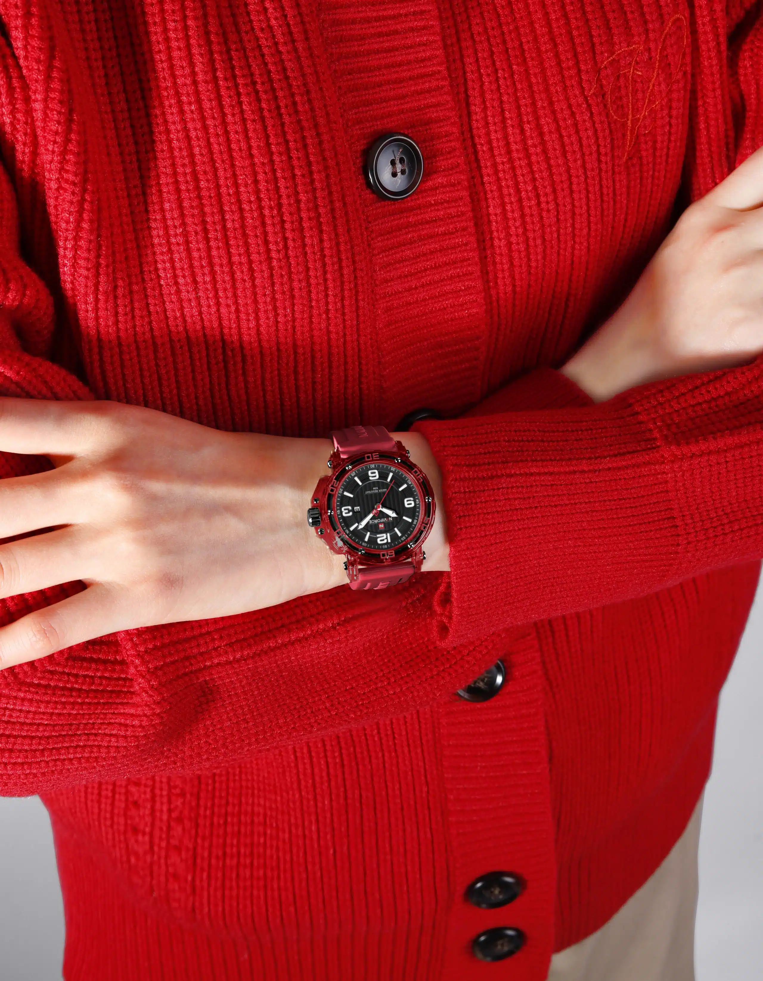 ساعت مچی زنانه Naviforce NF7125 انتخابی برجسته برای کسانی است که به استایل اسپرت، جوانپسند و پرانرژی اهمیت میدهند. بند سیلیکونی قرمز پویا در کنار صفحهی مشکیِ مدرن ترکیبی جذاب و چشمگیر خلق میکند که با استایلهای کژوال، ورزشی و روزمره بهخوبی هماهنگ میشود.