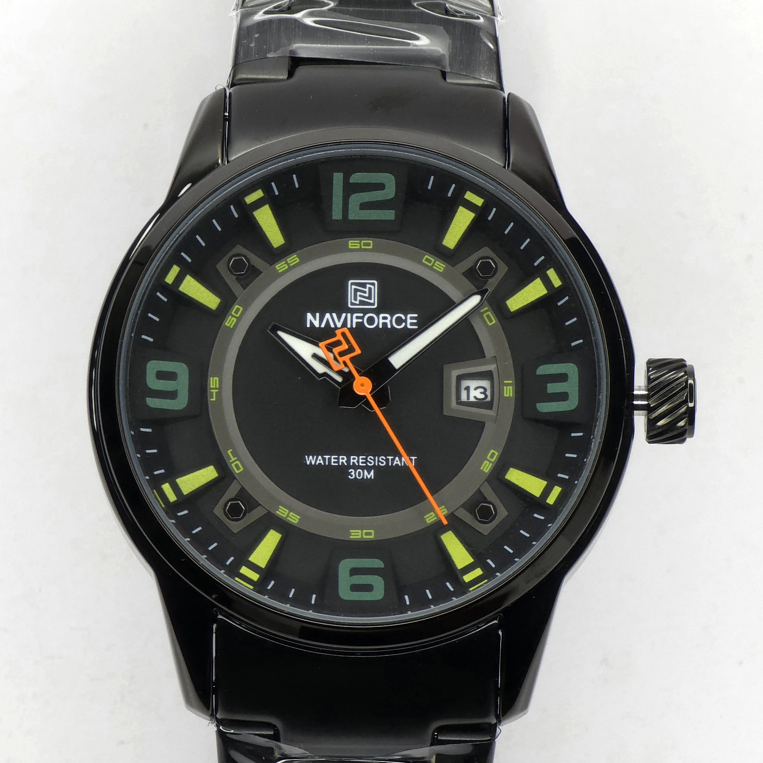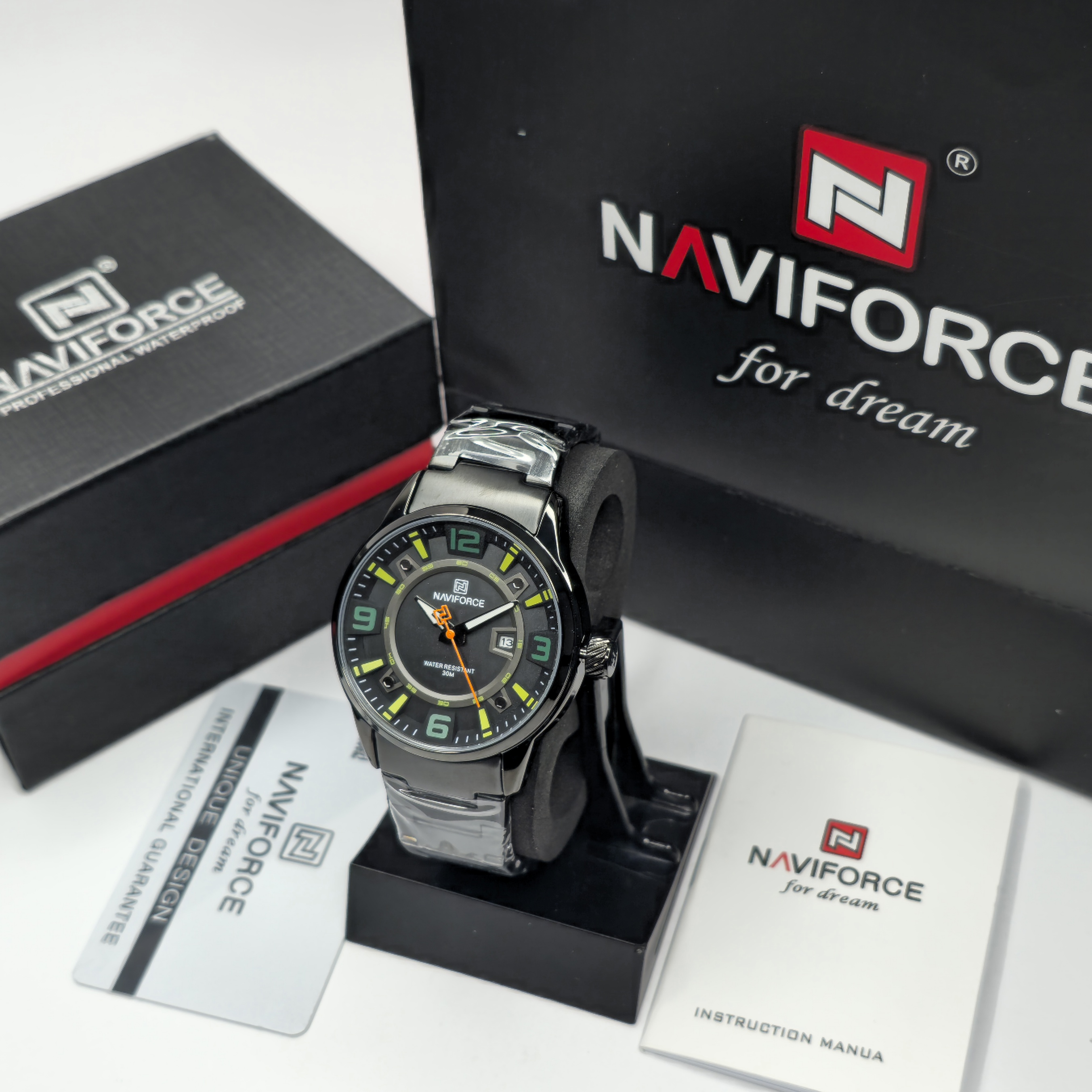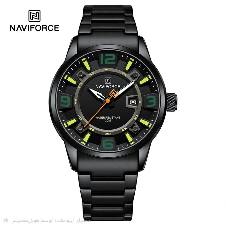ساعت مچی مردانه Naviforce مدل NF8044 انتخابی ایدهآل برای آقایانی است که به دنبال ترکیبی از سبک اسپرت و کلاسیک میگردند. این مدل با بند فلزی مشکی و صفحه مشکی-سبز، جلوهای مدرن و در عین حال شیک ارائه میدهد و میتواند به راحتی با استایل رسمی یا روزمره ست شود.بدنه مقاوم این ساعت از آلیاژ باکیفیت ساخته شده و شیشهی معدنی مقاوم در برابر خط و خش، از صفحه محافظت میکند. موتور کوارتز دقیق و نمایشگر تاریخ، عملکرد حرفهای و دقت بالای ساعت را تضمین میکنند. مقاومت در برابر آب تا 3ATM، خیال شما را در استفادهی روزمره از بارش آب یا پاشش تصادفی راحت میسازد.طراحی اسپرت قاب و رنگبندی صفحه، باعث شده NF8044 برای موقعیتهای مختلف، از محیط کار تا دورهمیهای دوستانه، انتخابی مناسب باشد. این ساعت نمادی از کیفیت، استحکام و استایل مردانه است که به راحتی توجه هر بینندهای را جلب میکند.