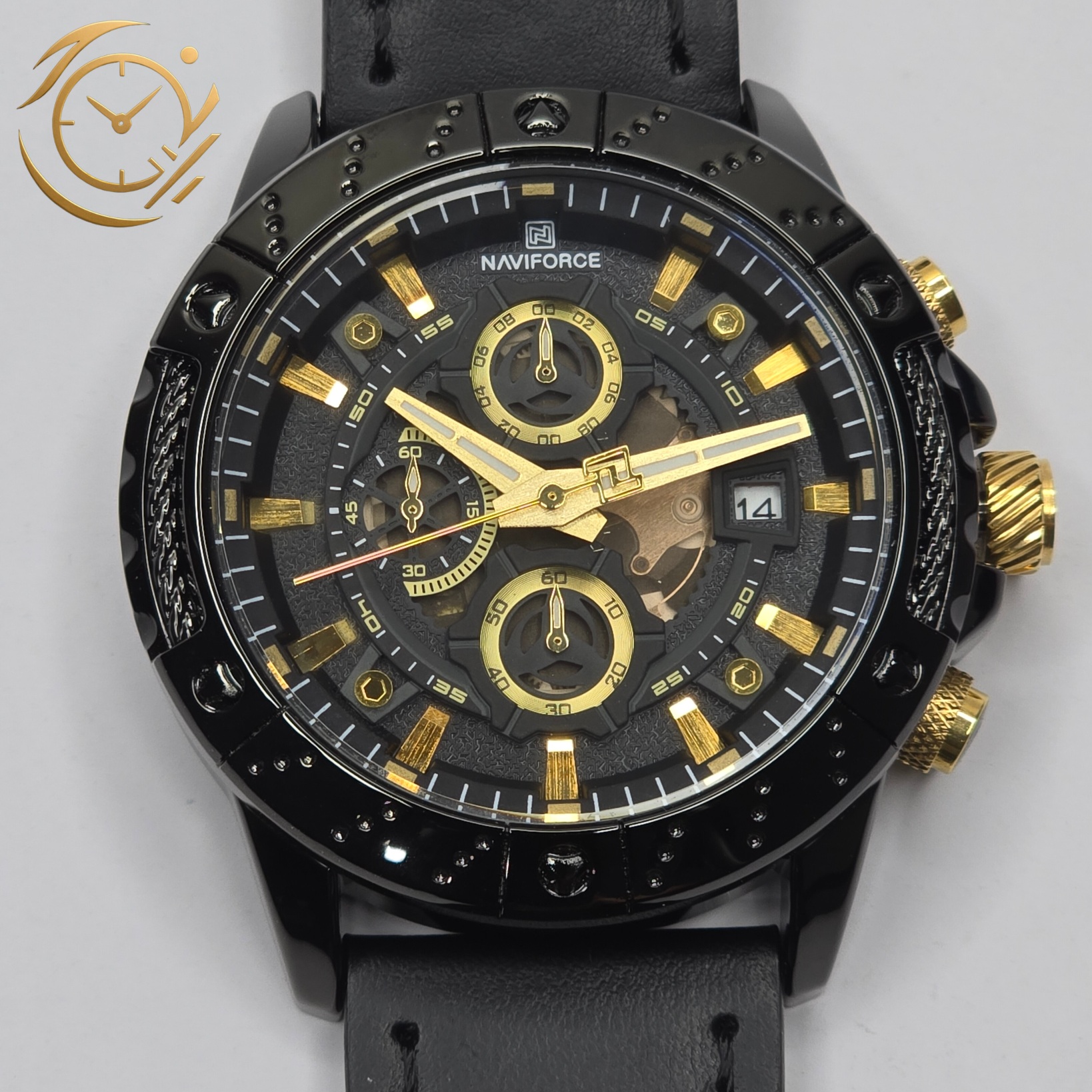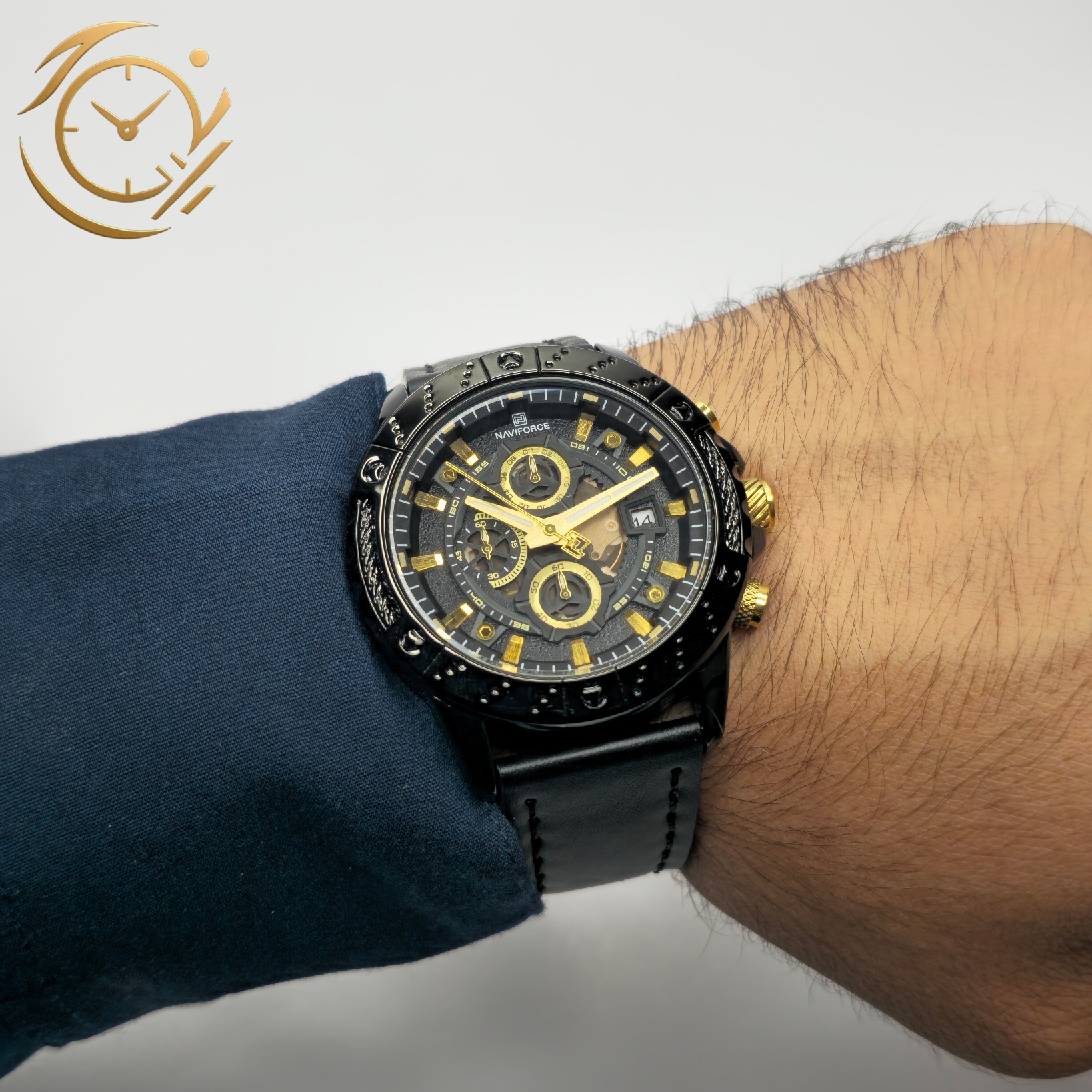 ساعت Naviforce NF8055 با ترکیب رنگ مشکی کلاسیک و طلایی لوکس، انتخابی بینظیر برای آقایانی است که به دنبال استایل اسپرت، مدرن و جذاب هستند.بند چرمی مشکی با دوخت دقیق و کیفیت بالا، راحتی و دوام عالی را ارائه میدهد و جلوهای کلاسیک و قدرتمند به مچ دست شما میبخشد. صفحه مشکی با جزئیات طلایی و کرونوگراف حرفهای، ظاهری چشمگیر و پویا ایجاد کرده و علاوه بر زیبایی، عملکرد دقیق و حرفهای ساعت را تضمین میکند.این ترکیب مشکی و طلایی باعث شده ساعت NF8055 برای استایل روزمره، موقعیتهای اسپرت و حتی مهمانیهای شبانه مناسب باشد. موتور دقیق و قاب مقاوم ناویفورس نیز دوام و عملکرد بینقص ساعت را تضمین میکند.اگر به دنبال یک ساعت مردانه هستید که جلوهای اسپرت، لوکس و متمایز داشته باشد و استایل شما را متفاوت کند، Naviforce NF8055 بند چرمی مشکی صفحه مشکی طلایی کرونوگراف بهترین انتخاب خواهد بود.
