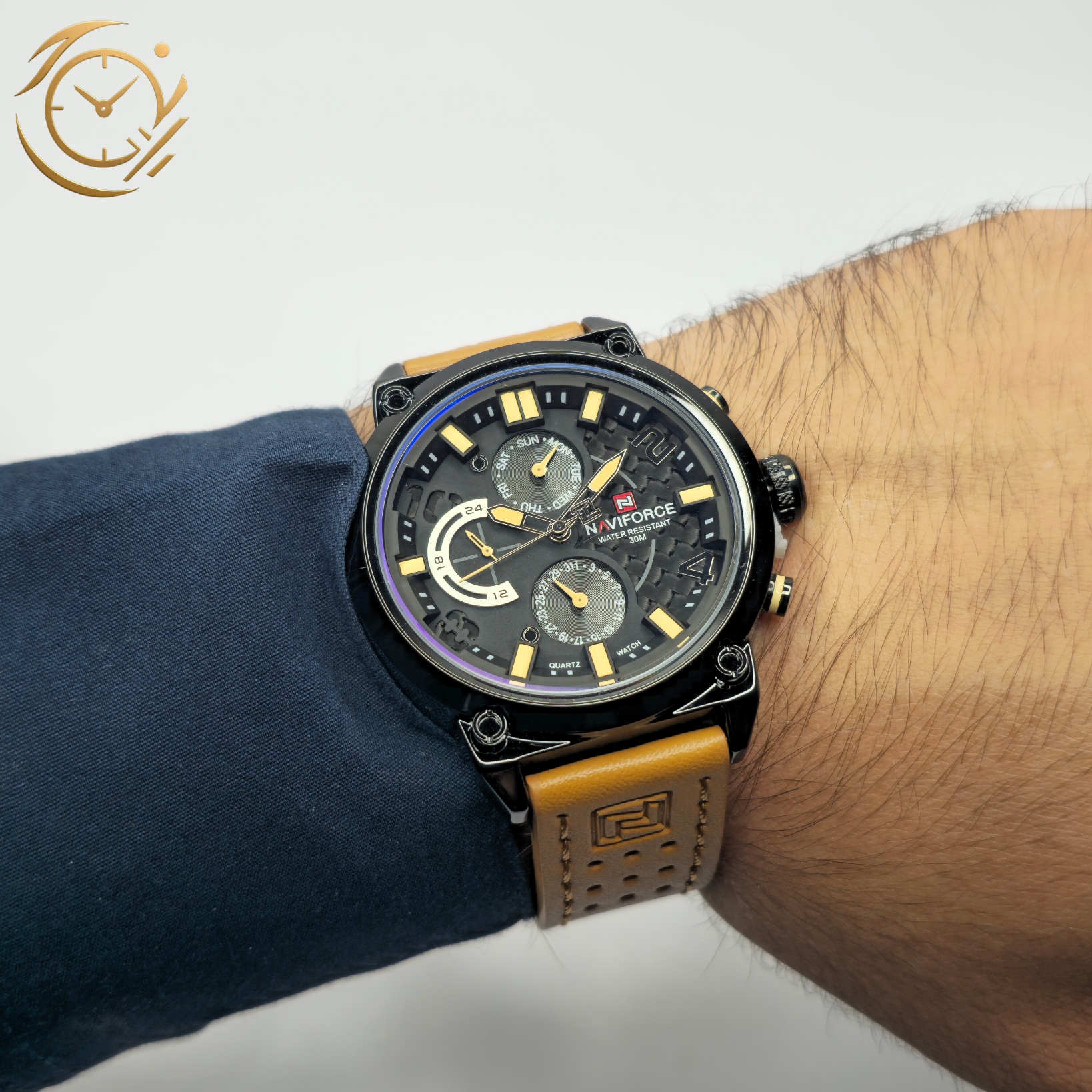 ساعت مچی مردانه Naviforce مدل NF9229 | بند چرمی قهوه ای، صفحه مشکی زرد | اسپرت و فول تایم