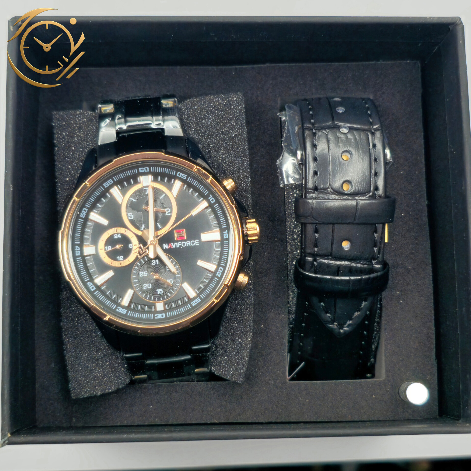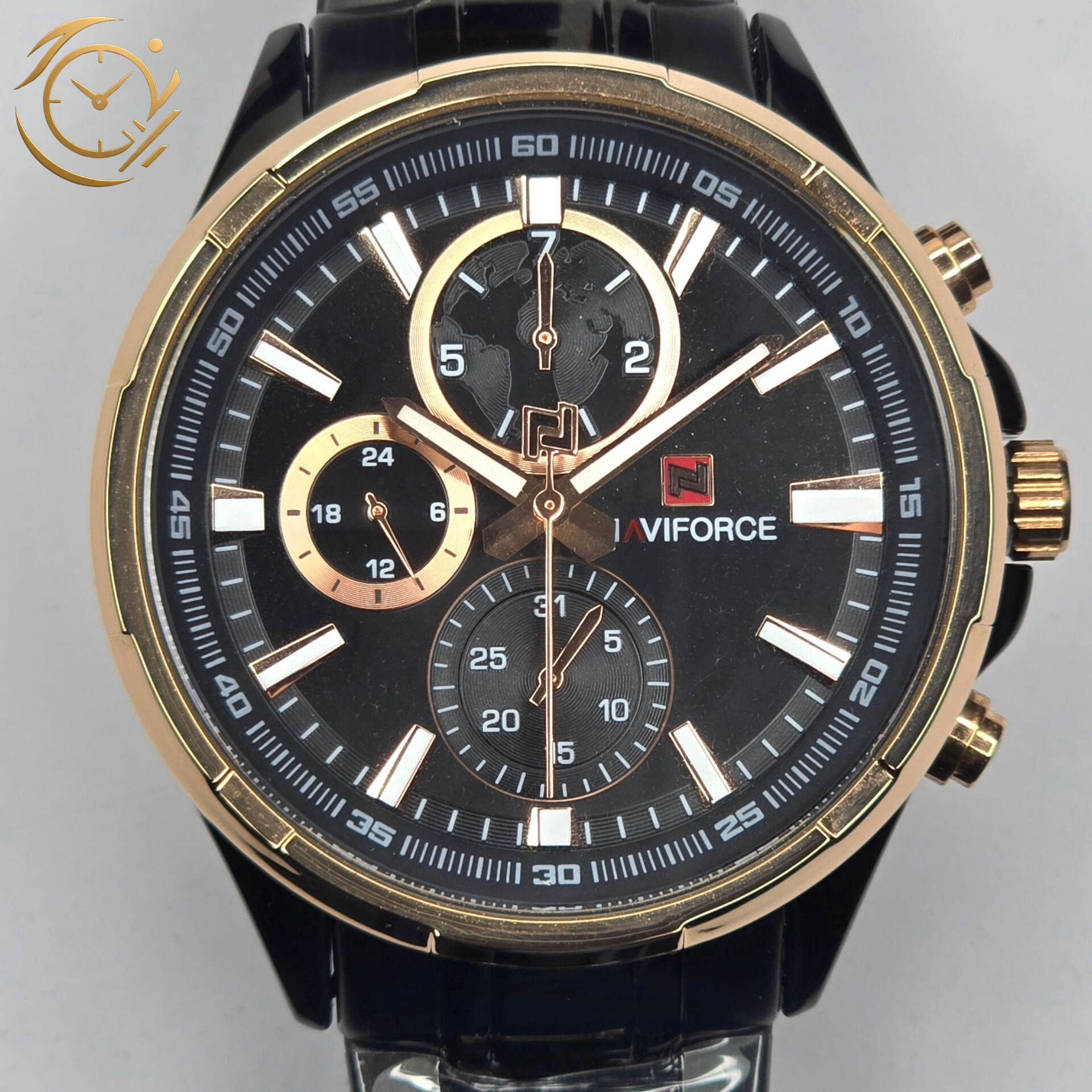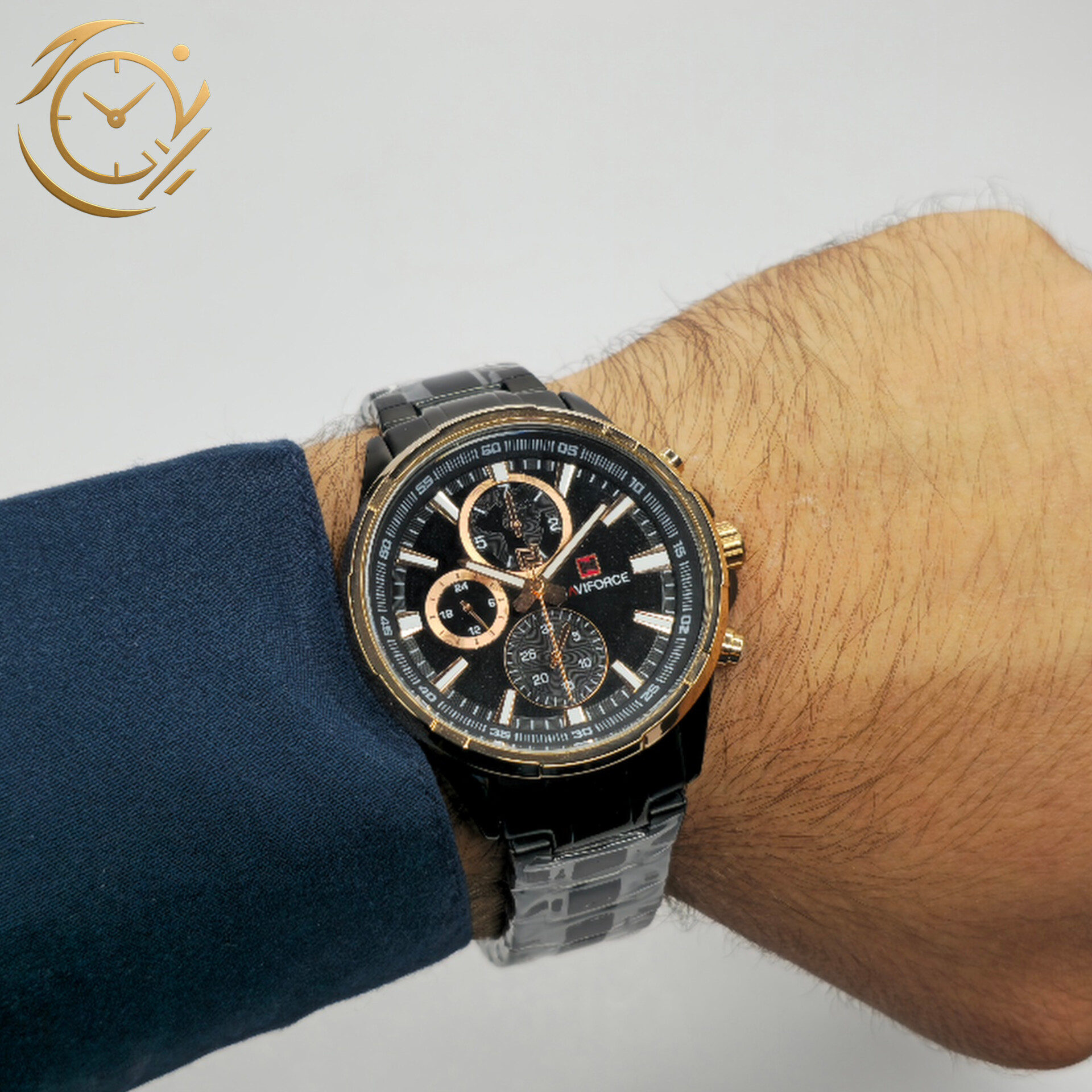 ساعت Naviforce NF9089 با ترکیب خاص مشکی و رزگلد، انتخابی منحصربهفرد برای آقایانی است که به دنبال استایلی اسپرت و در عین حال شیک و لوکس هستند. بند استیل مشکی مات، حس استحکام و قدرت را منتقل میکند و در کنار صفحه مشکی با جزئیات رزگلد، جلوهای مدرن و چشمنواز به این ساعت میبخشد.این مدل به سه موتور دقیق مجهز است که علاوه بر نمایش زمان، عملکردی حرفهای و کاربردی ارائه میدهد. طراحی سابدایلها با رنگ رزگلد، جذابیت و عمق بیشتری به صفحه ساعت داده و باعث میشود نگاهها ناخودآگاه به سمت آن جلب شوند.بدنه و بند فلزی ضدزنگ این ساعت، مقاومت بالایی در برابر خط و خش و استفاده روزمره دارند. ترکیب رنگ مشکی و رزگلد نیز باعث شده تا این مدل بتواند به راحتی هم در استایلهای اسپرت و کژوال و هم در پوششهای نیمهرسمی بدرخشد.اگر به دنبال ساعتی هستید که هم استحکام یک ساعت اسپرت و هم جذابیت یک اکسسوری لوکس را داشته باشد، Naviforce NF9089 مشکی رزگلد انتخابی بینقص برای شماست.