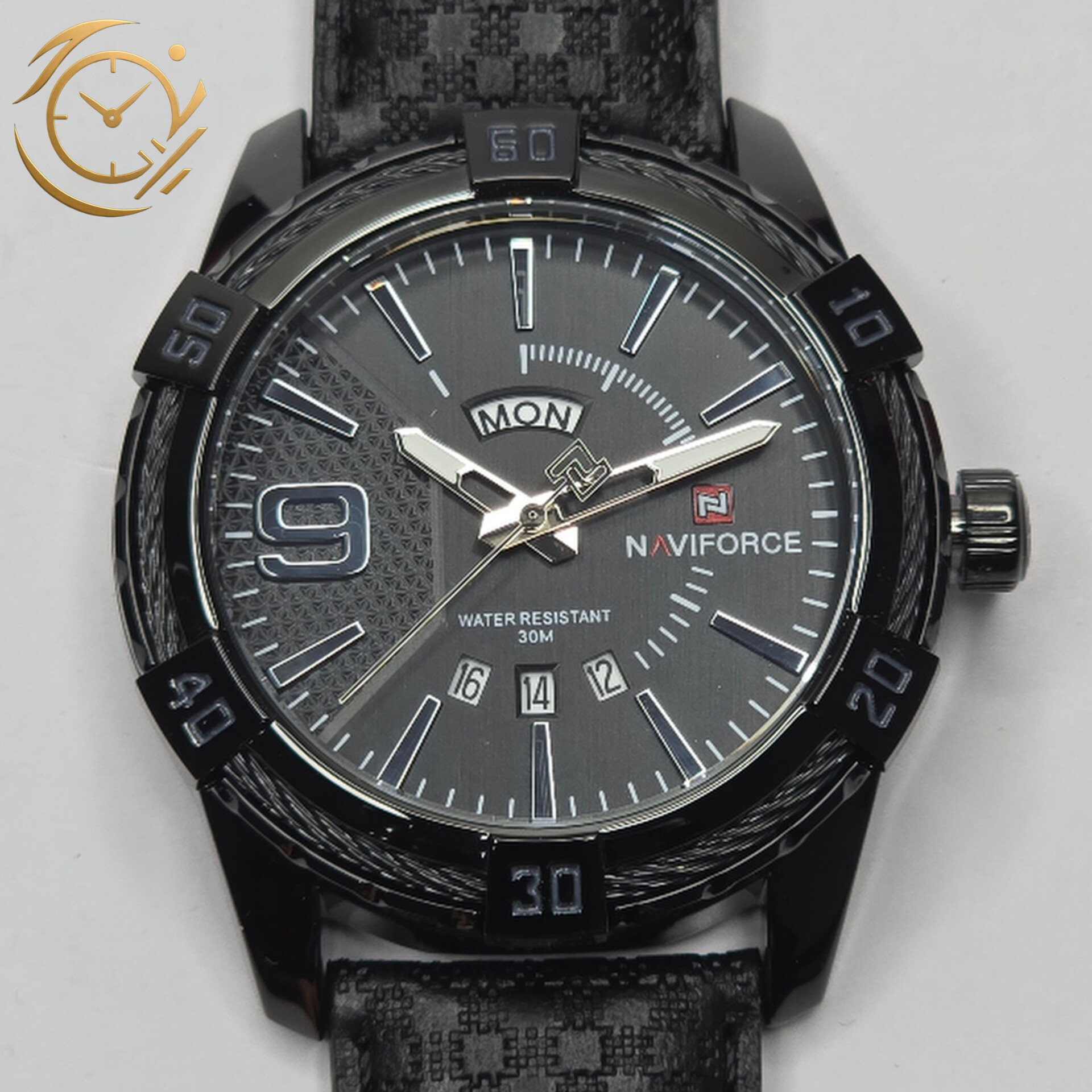 ساعت مچی مردانه Naviforce مدل NF9117 | بند چرمی مشکی، صفحه مشکی رزگلد، نمایش روز هفته و تاریخ