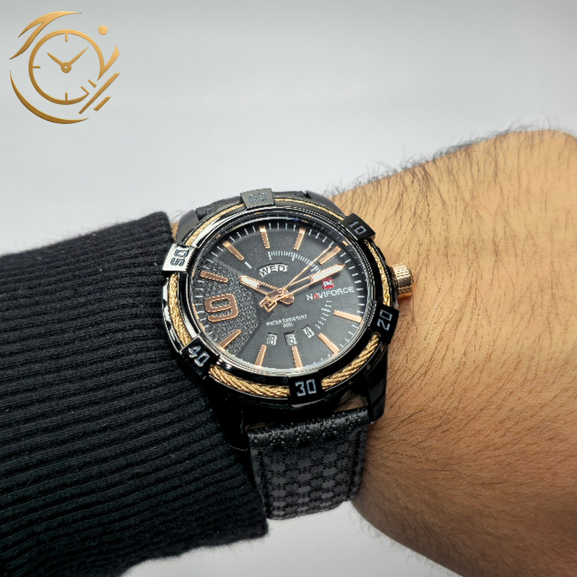 ساعت مچی مردانه Naviforce مدل NF9117 | بند چرمی مشکی، صفحه مشکی رزگلد، نمایش روز هفته و تاریخ