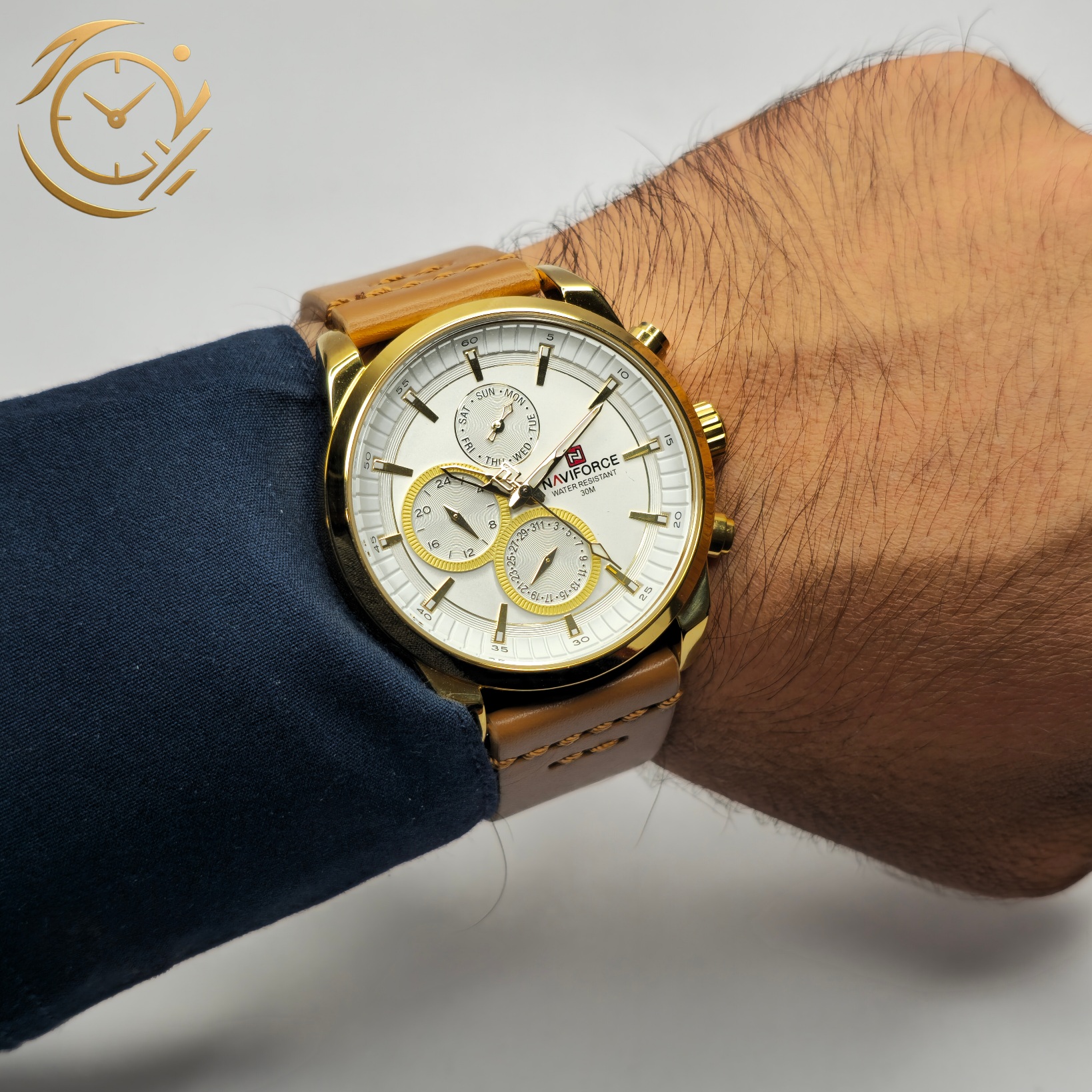 ساعت مچی مردانه Naviforce مدل NF9229 | بند چرمی قهوه ای، صفحه مشکی زرد | اسپرت و فول تایم