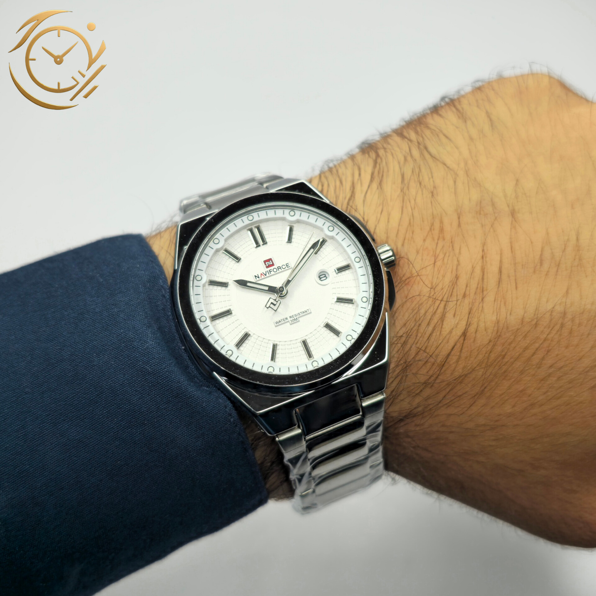 ساعت مچی Naviforce NF9212 با طراحی کلاسیک و مینیمال، انتخابی ایدهآل برای آقایانی است که به دنبال ترکیب شیک بودن، رسمی بودن و دوام بالا هستند. بند استیل ضد زنگ جلوهای لوکس و حرفهای ایجاد کرده و مقاومت بالایی برای استفاده روزمره و رسمی فراهم میکند.صفحه سفید کلاسیک با طراحی ساده و خوانا، ظاهری آرام و شیک به ساعت میبخشد و آن را به گزینهای مناسب برای ست کردن با کت و شلوار، پوشش اداری یا استایل نیمهرسمی تبدیل کرده است. تضاد رنگ سفید صفحه با بند نقرهای، جلوهای مدرن و شیک ایجاد کرده که استایل شما را کامل میکند.موتور باکیفیت ناویفورس و قاب مقاوم، تضمین میکند که این ساعت علاوه بر زیبایی، عملکرد دقیق و طولانیمدت داشته باشد. طراحی مینیمال و کلاسیک آن، حس وقار، اعتماد به نفس و سادگی مدرن را همزمان منتقل میکند و گزینهای مناسب برای محیطهای رسمی، جلسات کاری و مهمانیهای خاص است.اگر به دنبال ساعتی هستید که کلاسیک، لوکس و با دوام بالا باشد، ساعت Naviforce NF9212 بند استیل ضد زنگ صفحه سفید انتخابی مطمئن و جذاب برای تکمیل استایل رسمی شما خواهد بود.