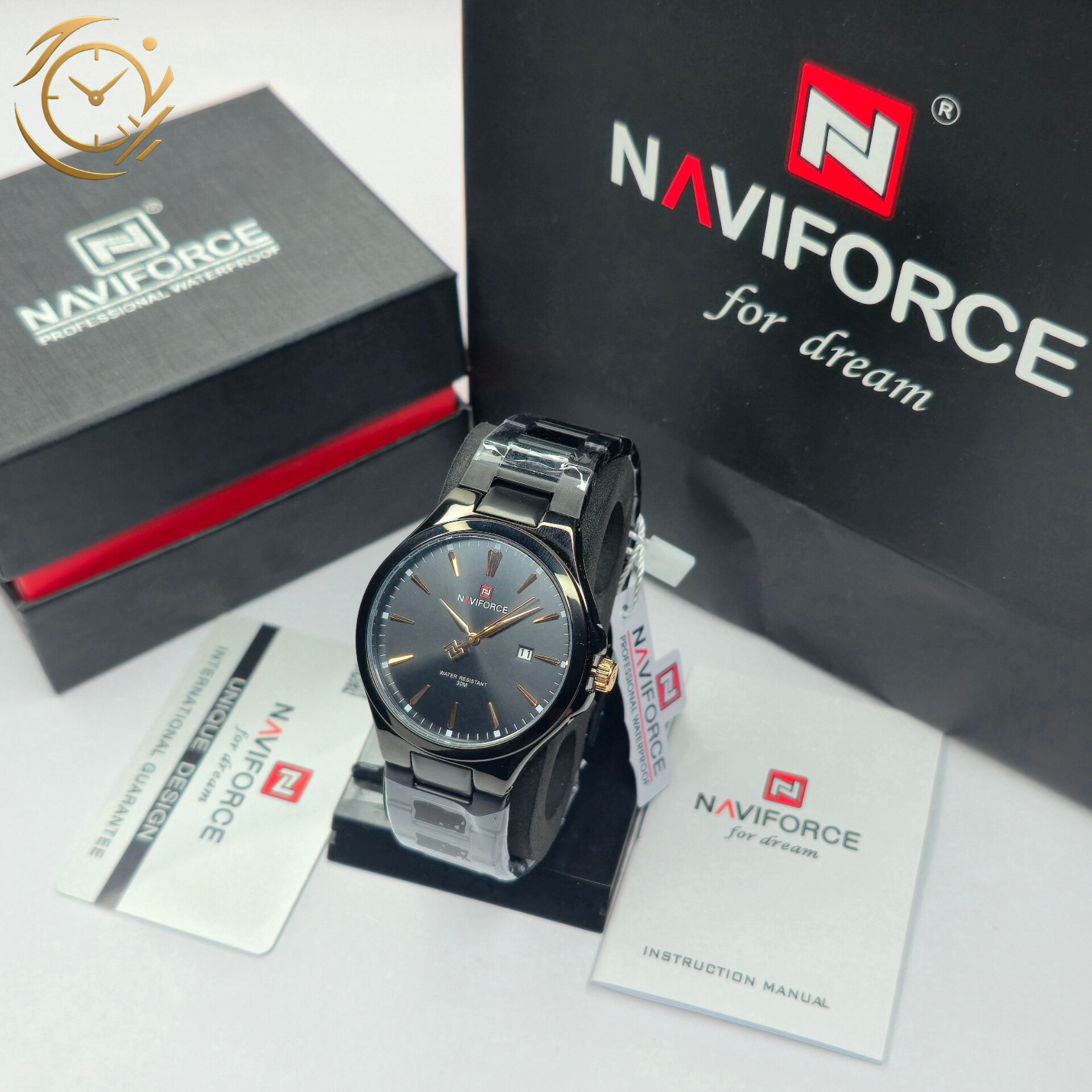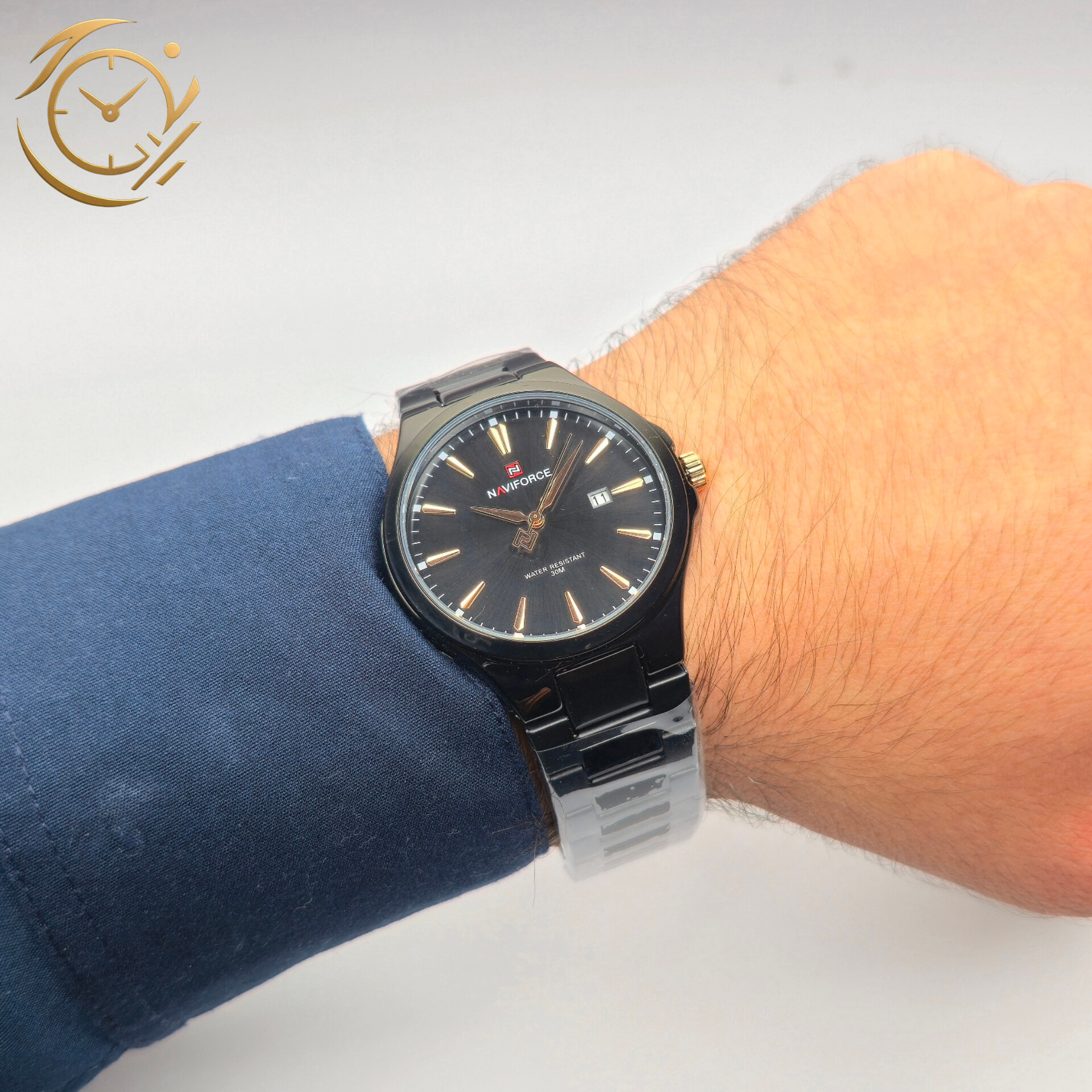 ساعت مچی مردانه Naviforce مدل NF9214 انتخابی ایدهآل برای استایلهای کلاسیک و رسمی است که جذابیت و سادگی را بهخوبی با هم ترکیب میکند. این مدل با بند فلزی مشکی و صفحهی مشکی یک طراحی یکدست و چشمنواز دارد که بهراحتی با کت و شلوار، پیراهن رسمی یا استایلهای روزمرهٔ شیک ست میشود.صفحه ساده و مینیمال ساعت، خوانش دقیق زمان را آسان میکند و طراحی کلاسیک آن باعث میشود این ساعت مناسبتهای رسمی، محیط کار یا مهمانیهای خاص باشد. بند فلزی مقاوم ظاهری لوکس و دوام بالا را برای استفاده روزمره تضمین میکند.اگر دنبال یک ساعت مردانهی رسمی، شیک و با کیفیت از برند Naviforce هستید، NF9214 با طراحی مشکی یکدست و ابهت خاص، گزینهای بسیار جذاب و همهپسند است.