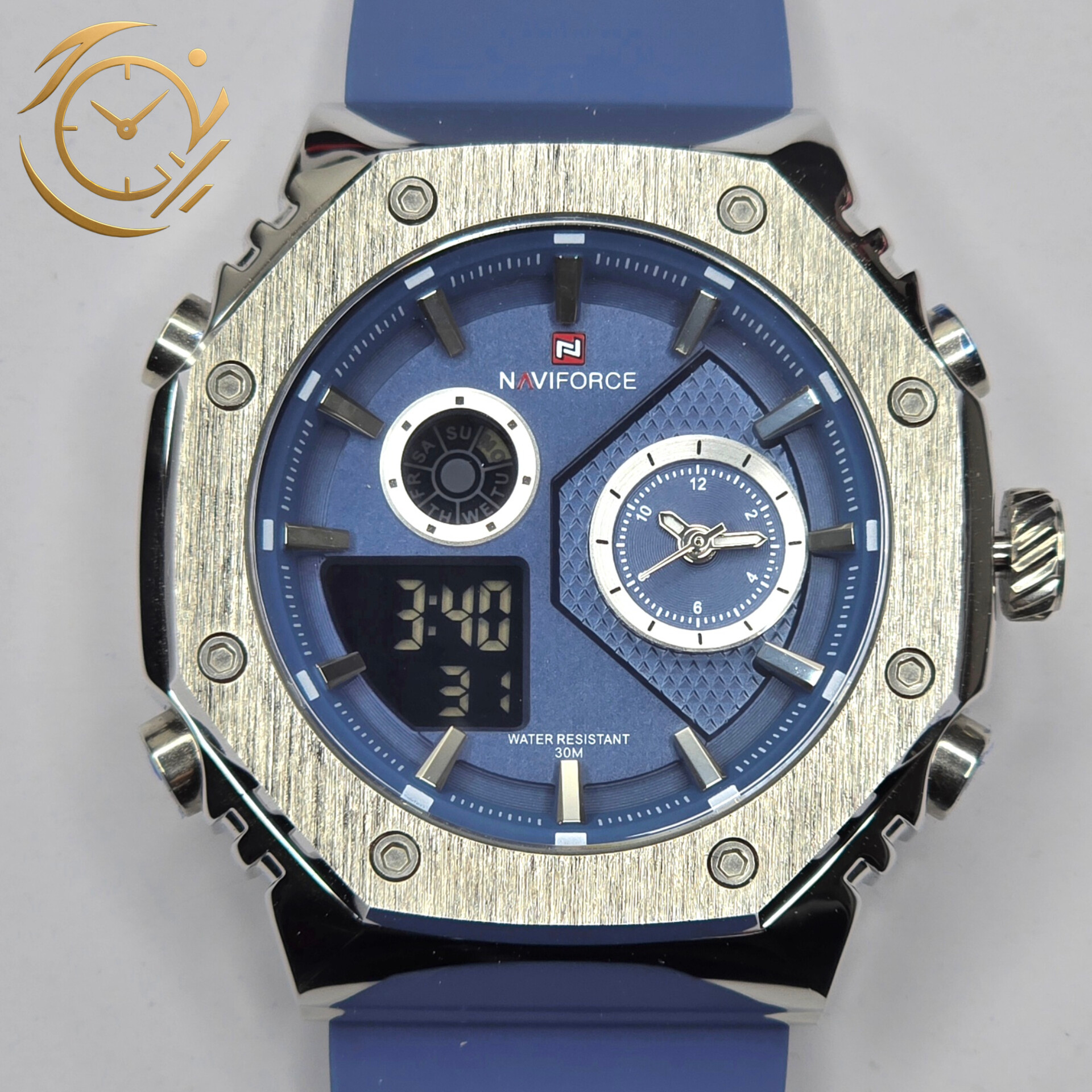 ساعت Naviforce NF9216 با ترکیب آنالوگ و دیجیتال، انتخابی بینظیر برای آقایانی است که به دنبال استایل اسپرت، مدرن و پرانرژی هستند.بند سیلیکونی آبی با انعطافپذیری بالا و راحتی مثالزدنی، امکان استفاده طولانیمدت را بدون خستگی فراهم میکند و جلوهای اسپرت و جوانپسند به مچ دست شما میبخشد. صفحه آبی با طراحی دوگانه آنالوگ و دیجیتال، علاوه بر ظاهری مدرن، کارایی بالایی برای نمایش دقیق زمان و عملکردهای جانبی مانند آلارم و کرنومتر ارائه میدهد.این مدل به دلیل ترکیب رنگی جذاب و طراحی کاربردی، برای فعالیتهای روزمره، ورزشهای سبک و استایلهای اسپرت مناسب است. قاب مقاوم و موتور دقیق ناویفورس نیز تضمین میکند که این ساعت علاوه بر زیبایی، دوام و عملکرد بینقص داشته باشد.اگر به دنبال یک ساعت مردانه هستید که جوانپسند، اسپرت و پرکاربرد باشد و در عین حال جلوهای متفاوت و جذاب داشته باشد، Naviforce NF9216 بند سیلیکونی آبی صفحه آبی آنالوگ و دیجیتال بهترین گزینه است.