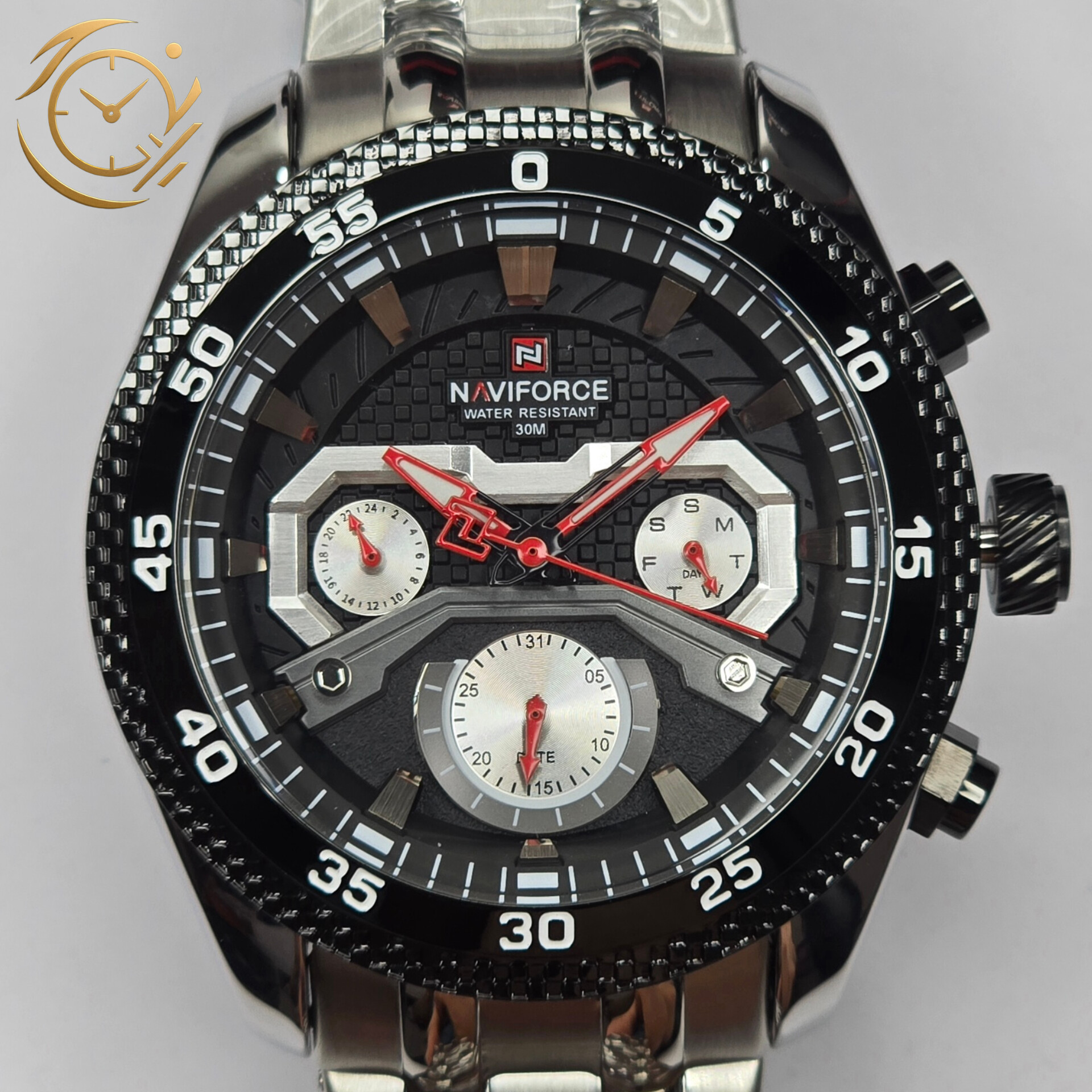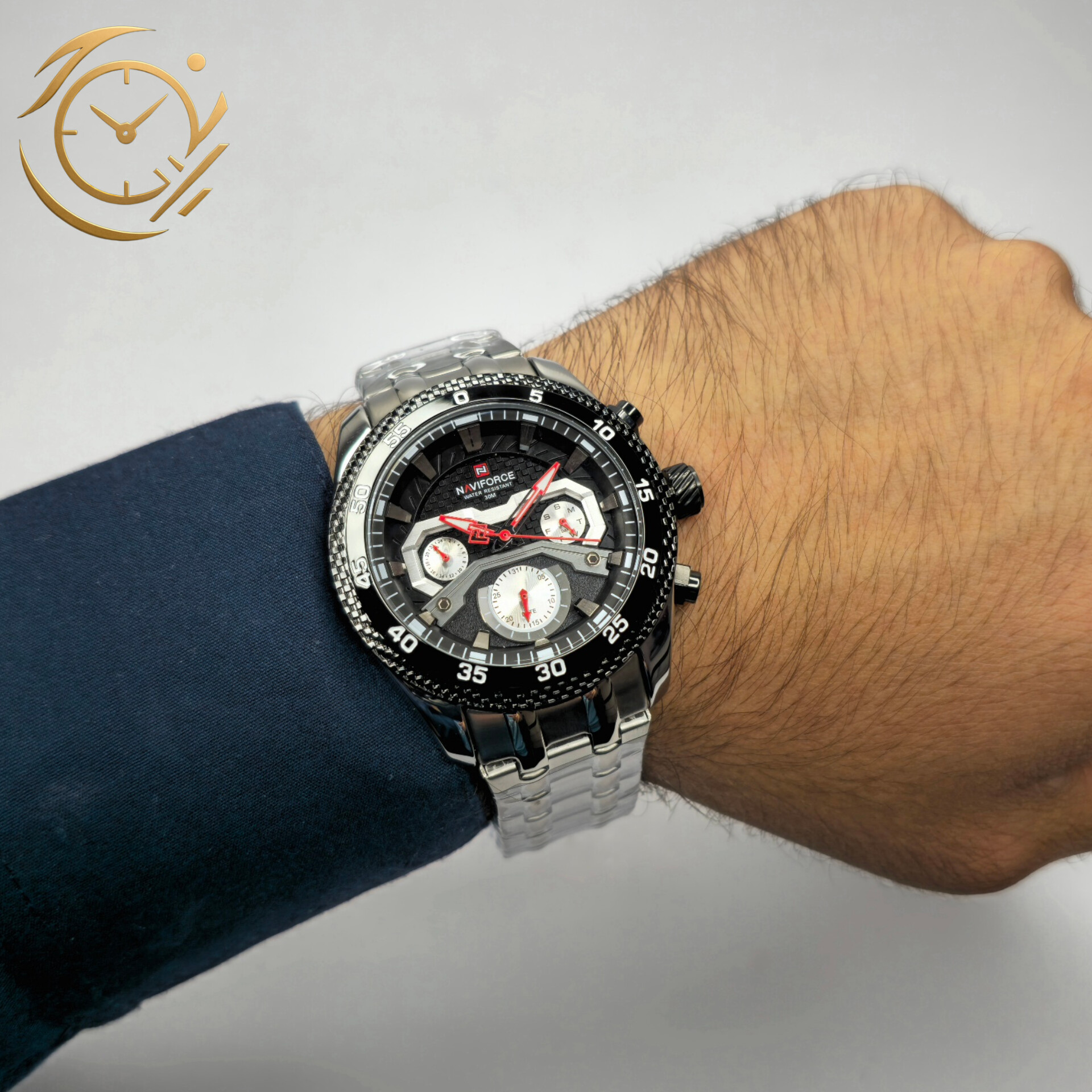ساعت Naviforce NF9222 با طراحی اسپرت و رنگبندی کلاسیک نقرهای و مشکی، انتخابی مناسب برای آقایانی است که به دنبال استایل مدرن، شیک و پرانرژی هستند.بند استیل نقرهای با کیفیت بالا علاوه بر دوام و مقاومت، جلوهای لوکس و حرفهای به مچ دست شما میبخشد. صفحه مشکی کرونوگراف، ظاهری جذاب و جدی ایجاد کرده و نمایش دقیق زمان و جزئیات فول تایم، عملکردی حرفهای و قابل اعتماد را تضمین میکند.این ترکیب رنگی مشکی و نقرهای، ساعت NF9222 را به انتخابی مناسب برای استایل اسپرت، فعالیتهای روزمره و حتی موقعیتهای نیمهرسمی تبدیل کرده است. موتور دقیق و قاب مقاوم ناویفورس، اطمینان میدهد که این ساعت علاوه بر زیبایی، دوام و عملکرد بینقص داشته باشد.اگر به دنبال یک ساعت مردانه هستید که جلوهای اسپرت، کلاسیک و باوقار داشته باشد و استایل شما را خاص کند، Naviforce NF9222 بند استیل نقرهای صفحه مشکی کرونوگراف انتخابی بینظیر و چشمگیر خواهد بود.