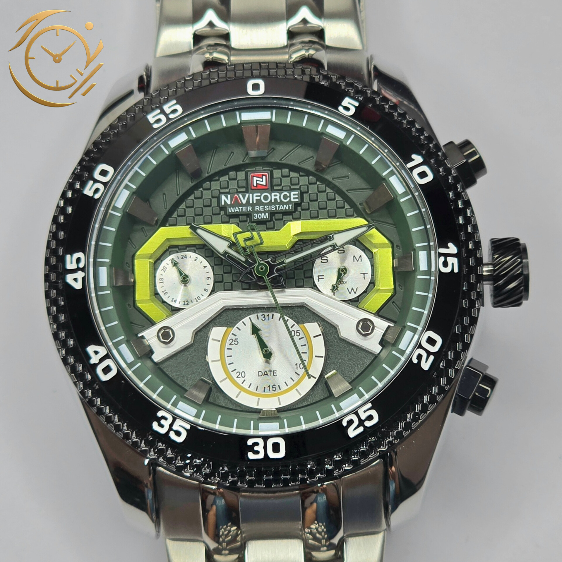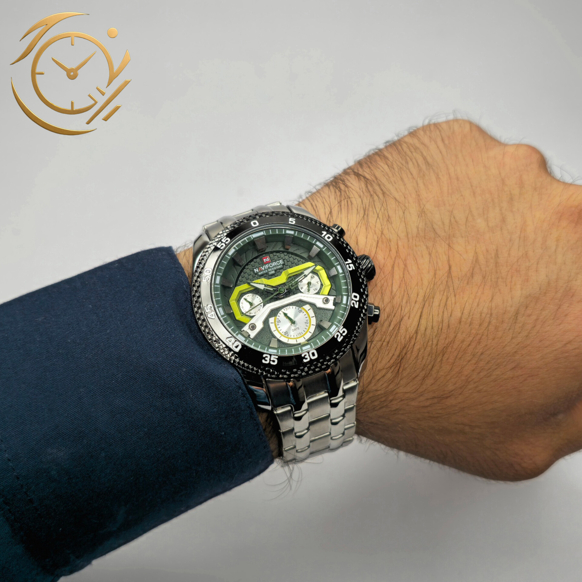 ساعت Naviforce NF9222 با ترکیب رنگ نقرهای شیک و صفحه سبز خاص، انتخابی ایدهآل برای آقایانی است که به دنبال استایل اسپرت و متفاوت هستند.بند استیل نقرهای مقاوم و براق، نه تنها دوام و کیفیت بالا ارائه میدهد، بلکه جلوهای مدرن و جذاب به مچ دست شما میبخشد. صفحه سبز کرونوگراف، حس انرژی و هیجان را منتقل کرده و طراحی اسپرت آن، به راحتی با استایلهای روزمره، مهمانیها و فعالیتهای نیمهرسمی هماهنگ میشود.جزئیات فول تایم صفحه، علاوه بر زیبایی، کارایی حرفهای را نیز تضمین میکند و عقربهها و نشانگرهای سبز روی پسزمینه نقرهای، خوانایی فوقالعادهای دارند. موتور دقیق و قاب مقاوم ناویفورس تضمین میکند که این ساعت علاوه بر ظاهر جذاب، دوام و عملکرد بینقص داشته باشد.اگر به دنبال یک ساعت مردانه هستید که جلوهای اسپرت، مدرن و خاص داشته باشد و استایل شما را متفاوت کند، Naviforce NF9222 بند استیل نقرهای صفحه سبز کرونوگراف گزینهای عالی و چشمگیر است.