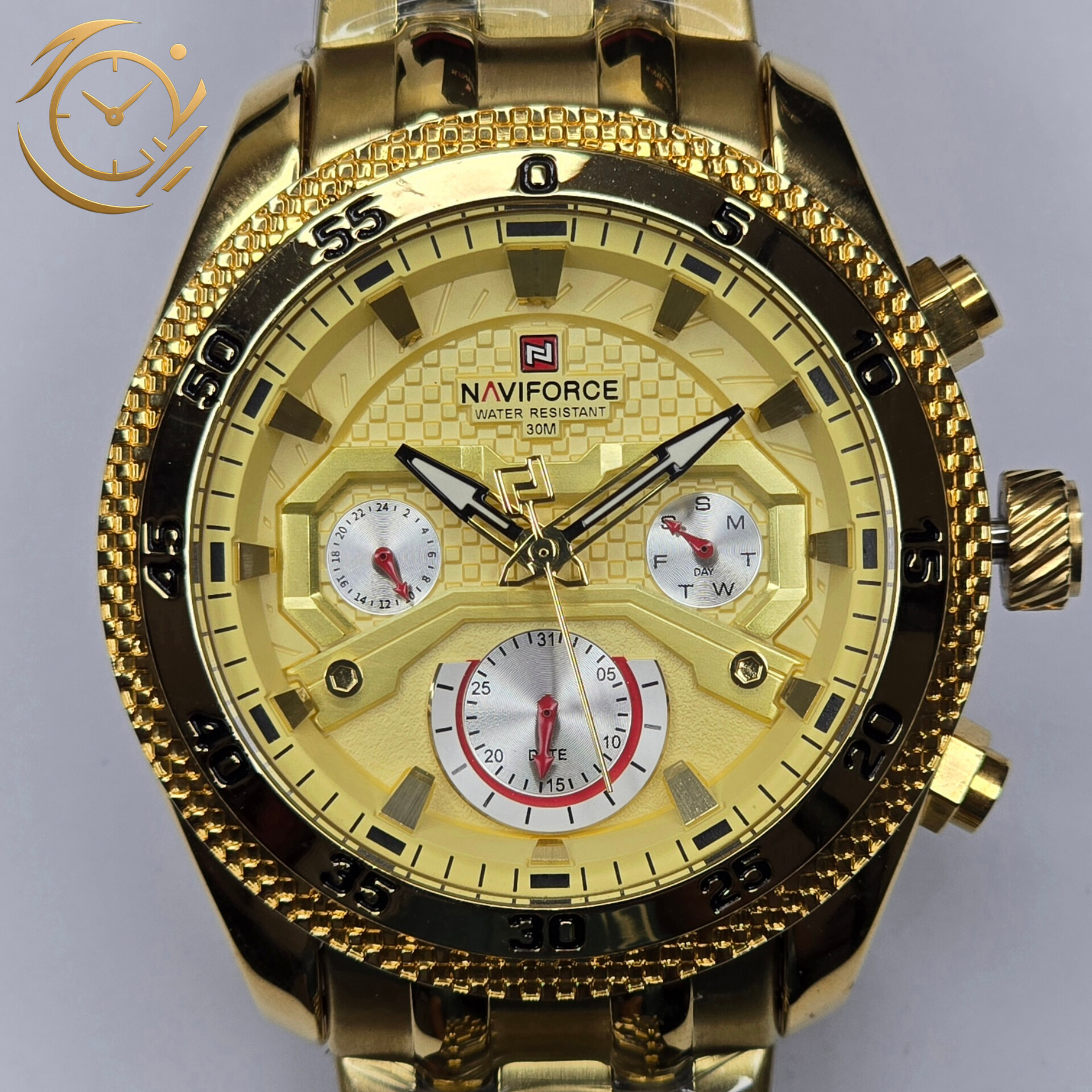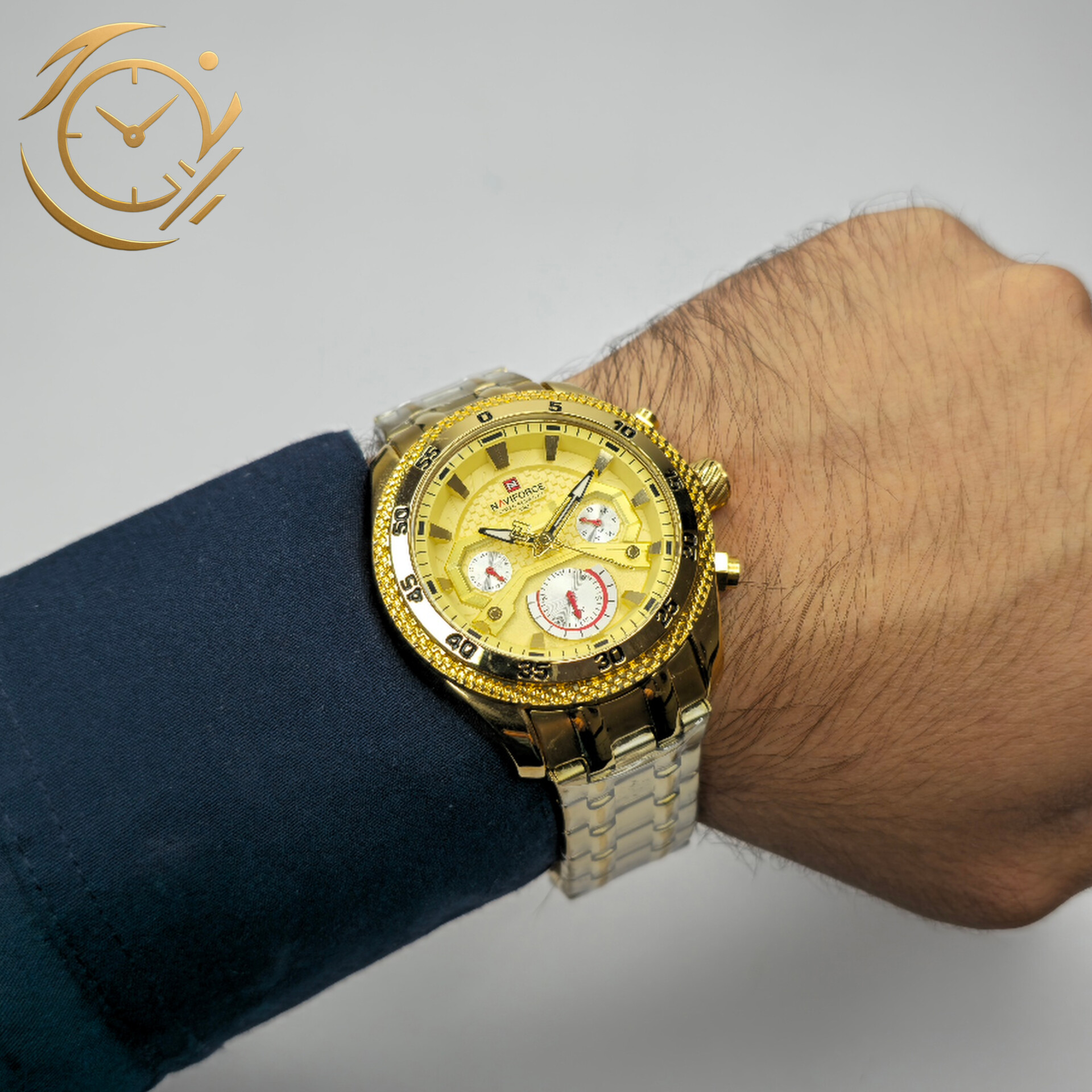 ساعت Naviforce NF9222 ترکیبی بینظیر از لوکس بودن، اسپرت و کارایی حرفهای است که برای آقایانی طراحی شده که دوست دارند استایلشان همیشه برجسته و چشمنواز باشد.بند استیل طلایی مات و براق با کیفیت بالا، نه تنها دوام و مقاومت فوقالعادهای ارائه میدهد، بلکه جلوهای اشرافی و جذاب به مچ دست شما میبخشد. صفحه طلایی با طراحی فول تایم دقیق، روحیه اسپرت و پویا را به همراه دارد و در عین حال، خوانایی بالا و جزئیات حرفهای آن، عملکردی قابل اعتماد را تضمین میکند.این ترکیب رنگی طلایی تمامعیار، هر نگاه را به سمت ساعت جذب میکند و برای موقعیتهای رسمی، مهمانیهای شبانه یا استایل روزمرهای که به یک اکسسوری لوکس نیاز دارد، انتخابی فوقالعاده است. موتور دقیق و قاب مقاوم ناویفورس، اطمینان میدهد که این ساعت علاوه بر زیبایی، دوام و عملکرد بینقص داشته باشد.اگر به دنبال یک ساعت مردانه هستید که جلوهای اسپرت، لوکس و متمایز داشته باشد و در هر جمعی شما را متفاوت نشان دهد، Naviforce NF9222 بند استیل طلایی صفحه طلایی کرونوگراف انتخابی بینظیر و چشمگیر خواهد بود.