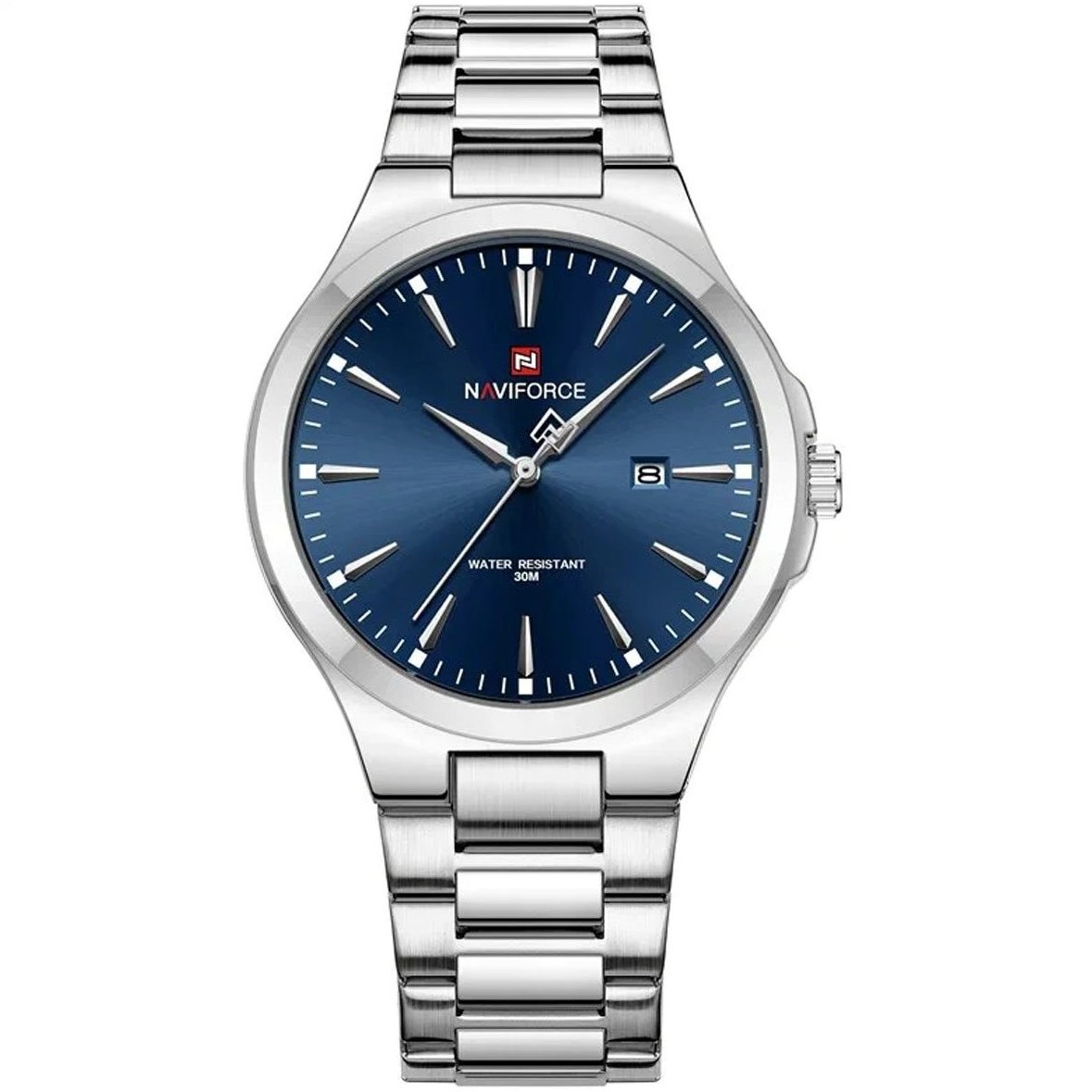 ساعت Naviforce NF9227 ترکیبی جذاب از طراحی مدرن و جزئیات کلاسیک است که برای آقایان شیکپوش طراحی شده است. بند استیل نقرهای ضدزنگ علاوه بر مقاومت بالا، جلوهای لوکس و درخشان ایجاد کرده و باعث میشود ساعت به راحتی با استایلهای رسمی و نیمهرسمی هماهنگ شود.صفحه سبز خاص و چشمنواز، جذابیت اصلی این مدل است که در کنار عقربهها و نشانگرهای دقیق، حس متفاوت و خاص بودن را منتقل میکند. طراحی کرونوگراف حرفهای نه تنها ظاهری اسپرت و مدرن به ساعت میدهد، بلکه کارایی آن را نیز افزایش داده و برای آقایانی که به دقت و جزئیات اهمیت میدهند، انتخابی بینظیر است.قاب مقاوم و موتور دقیق ناویفورس تضمین میکند که این ساعت علاوه بر ظاهر لوکس، دوام و عملکردی مطمئن داشته باشد. ترکیب رنگ سبز و نقرهای به ساعت جلوهای منحصربهفرد بخشیده و آن را به یک اکسسوری متمایز برای استایل روزمره، جلسات کاری و مهمانیها تبدیل میکند.اگر به دنبال یک ساعت مچی مردانه شیک، مقاوم و متفاوت هستید، ساعت Naviforce NF9227 بند استیل نقرهای صفحه سبز کرونوگراف میتواند همراه همیشگی شما باشد.