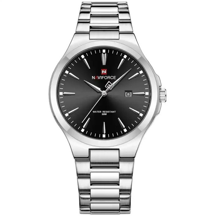 ساعت مچی مردانه Naviforce مدل NF8037 | بند سیلیکونی مشکی، صفحه مشکی، قاب نقره ای،فول تایم | اسپرت