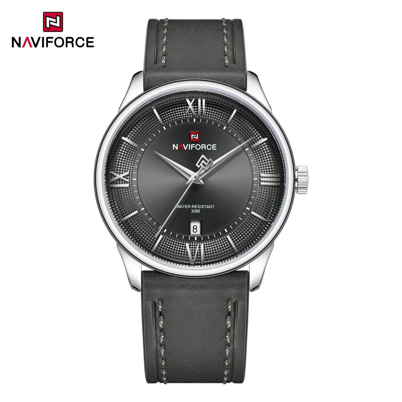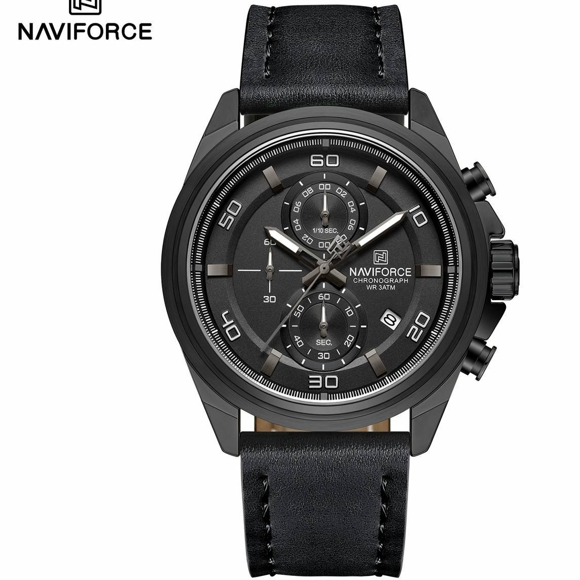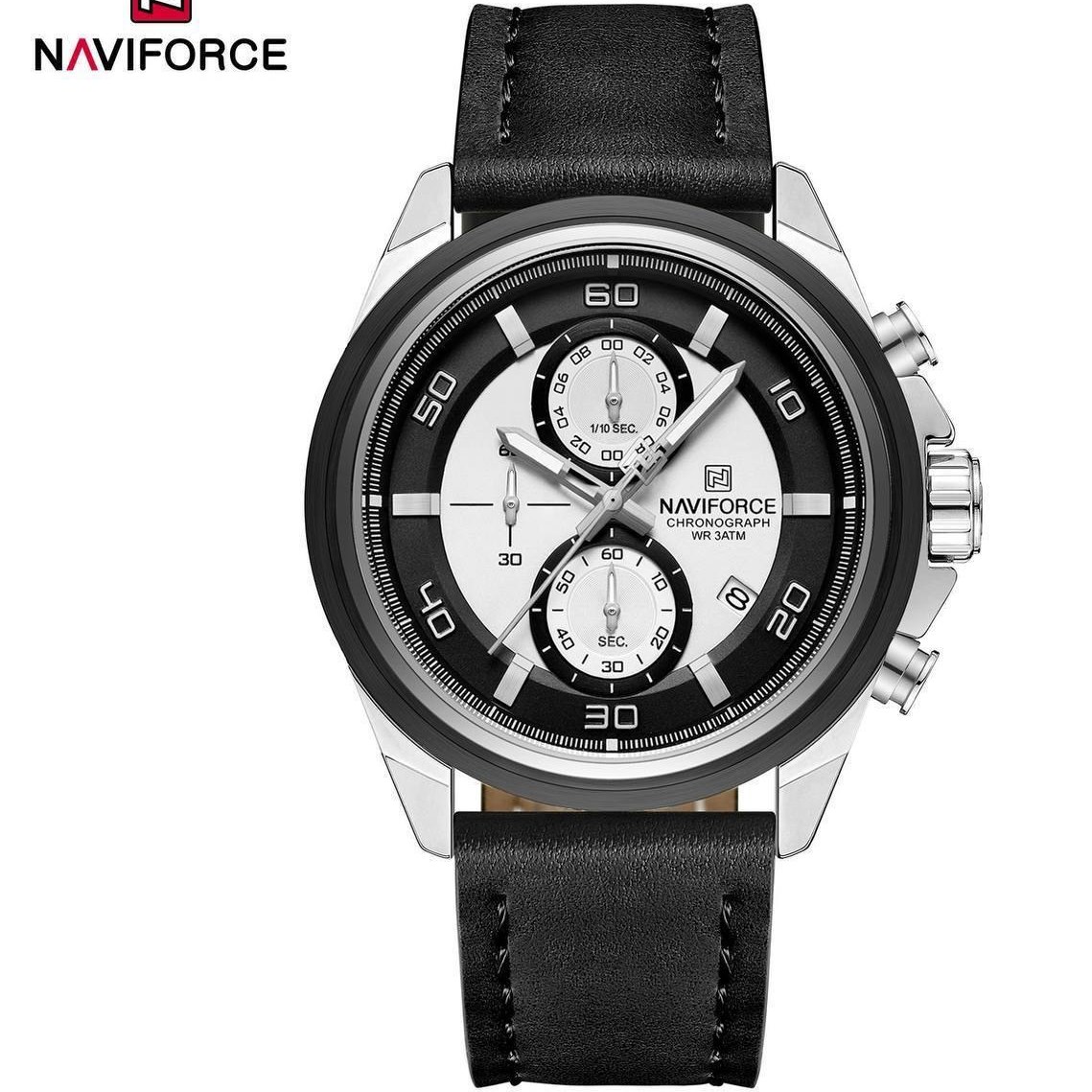 ساعت مچی مردانه Naviforce مدل NF9229 | بند چرمی مشکی، صفحه مشکی سفید | اسپرت و فول تایم