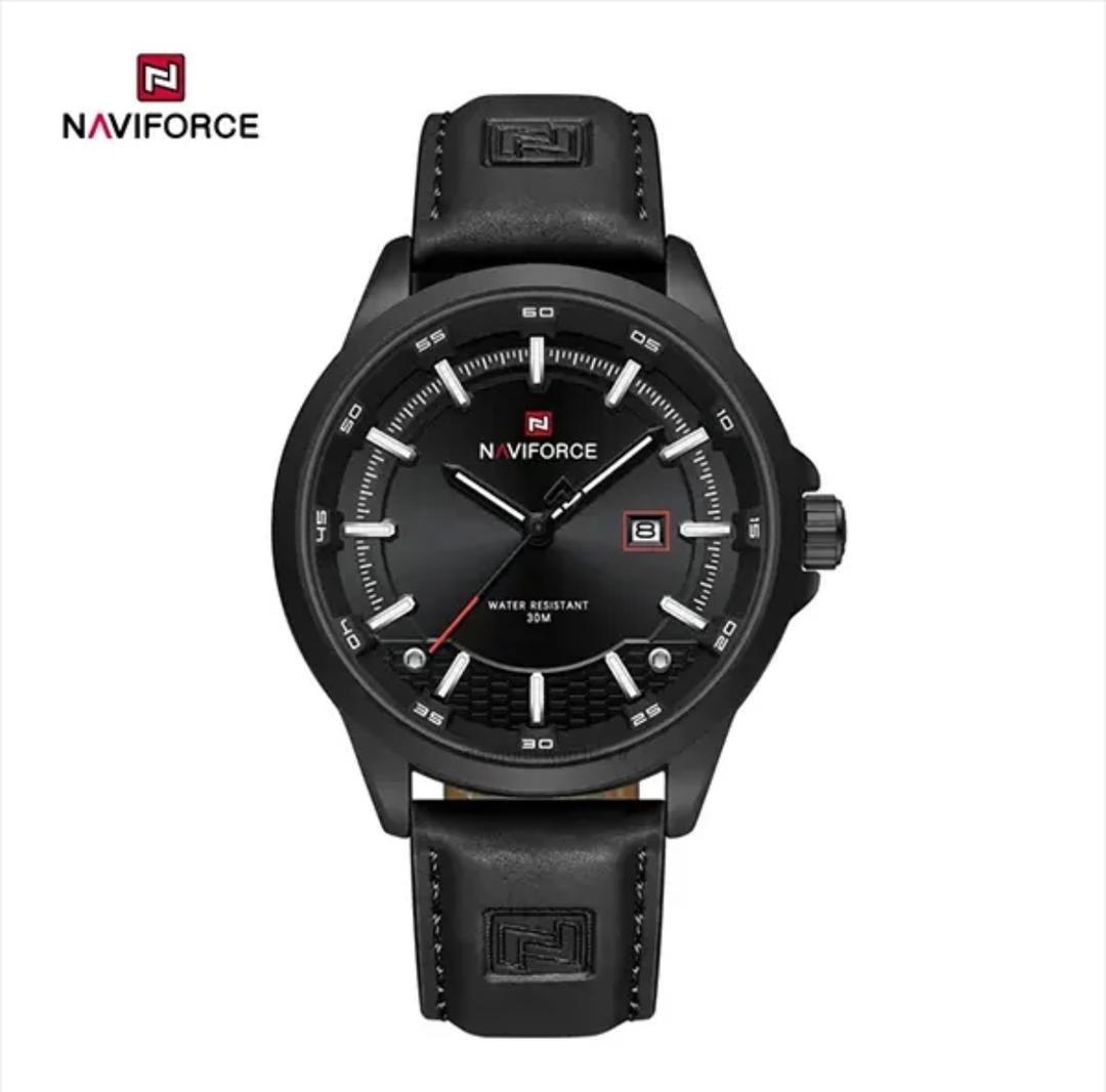 ساعت مچی مردانه Naviforce مدل NF9229 | بند چرمی مشکی، صفحه مشکی آبی | اسپرت و فول تایم