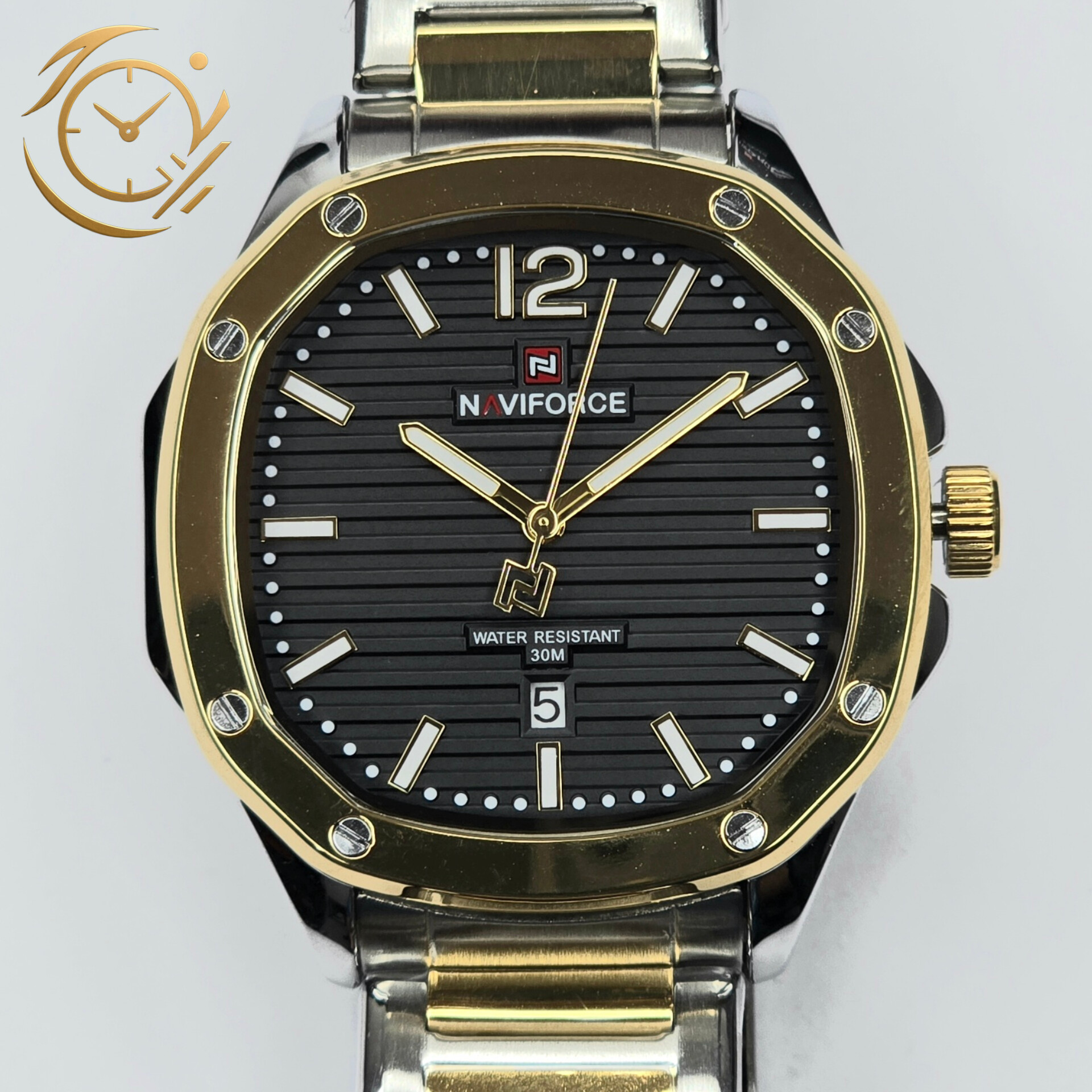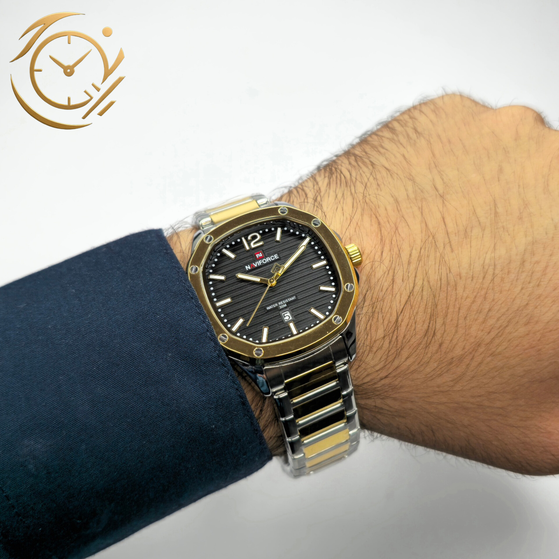 با ترکیب رنگی نقرهای – طلایی و صفحه مربعی مشکی، این ساعت جلوهای شیک و مدرن در عین حال کلاسیک دارد.بند استیل دو رنگ، تضادی چشمنواز در کنار قاب مربعی ایجاد کرده و صفحه مشکی ظریف، حس جدیت و وقار را دوچندان میکند. طراحی ساده و در عین حال لوکس این مدل باعث میشود برای جلسات کاری، محیطهای رسمی و استایلهای نیمهکلاسیک انتخابی عالی باشد.موتور دقیق ناویفورس به همراه متریال مقاوم، تضمینکنندهی عملکردی ماندگار است. این ساعت نه تنها وسیلهای برای مدیریت زمان، بلکه اکسسوریای باوقار و متفاوت برای آقایان خوشاستایل محسوب میشود.