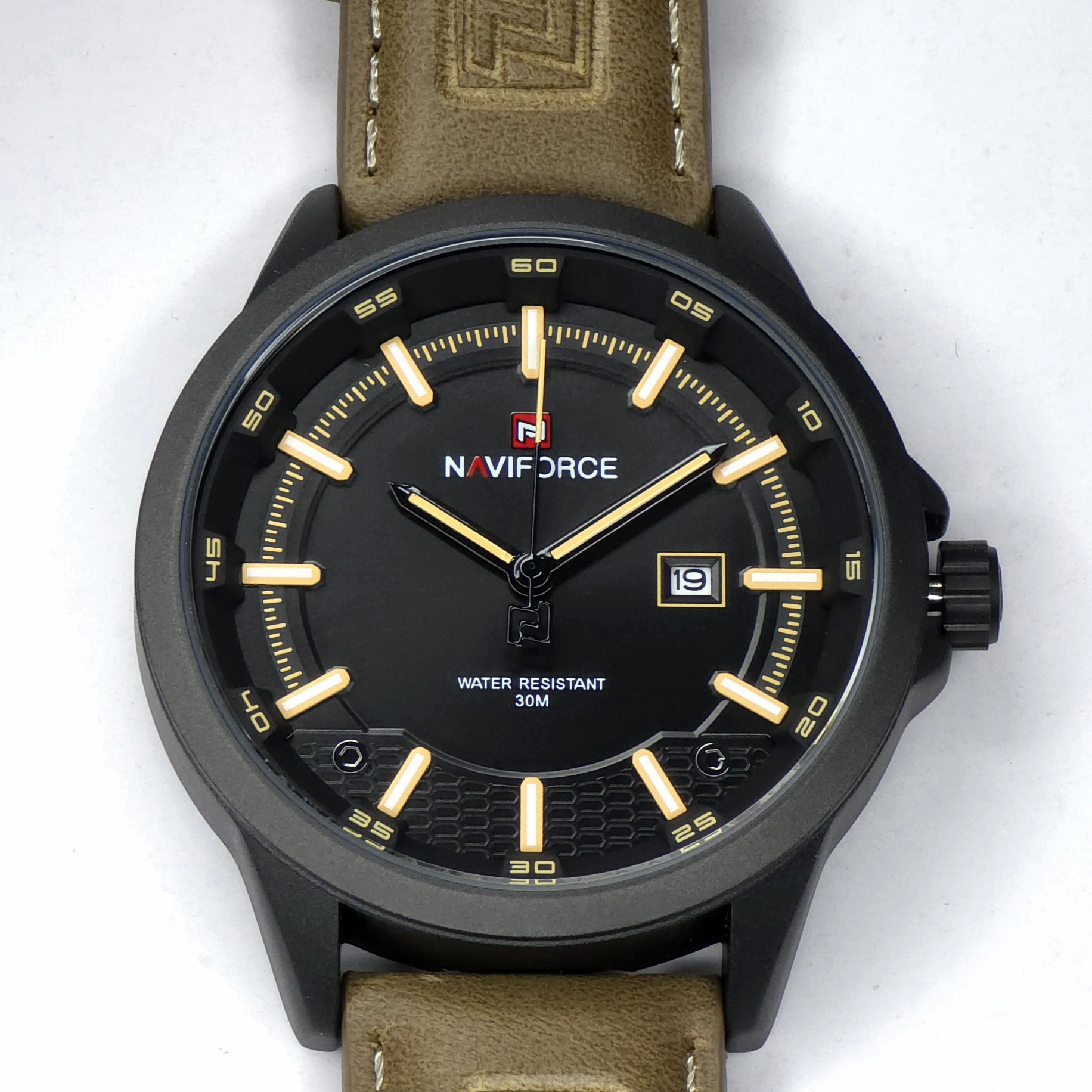 ساعت مچی مردانه Naviforce مدل NF9229 | بند چرمی قهوه ای، صفحه مشکی نارنجی | اسپرت و فول تایم