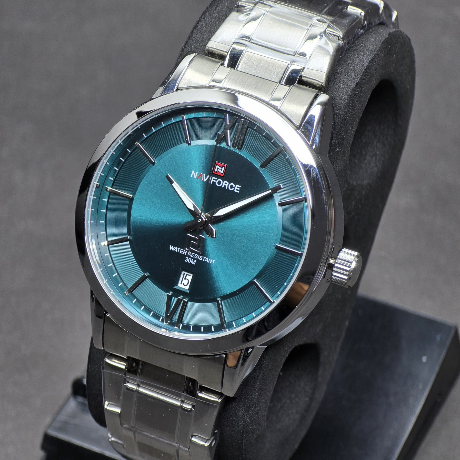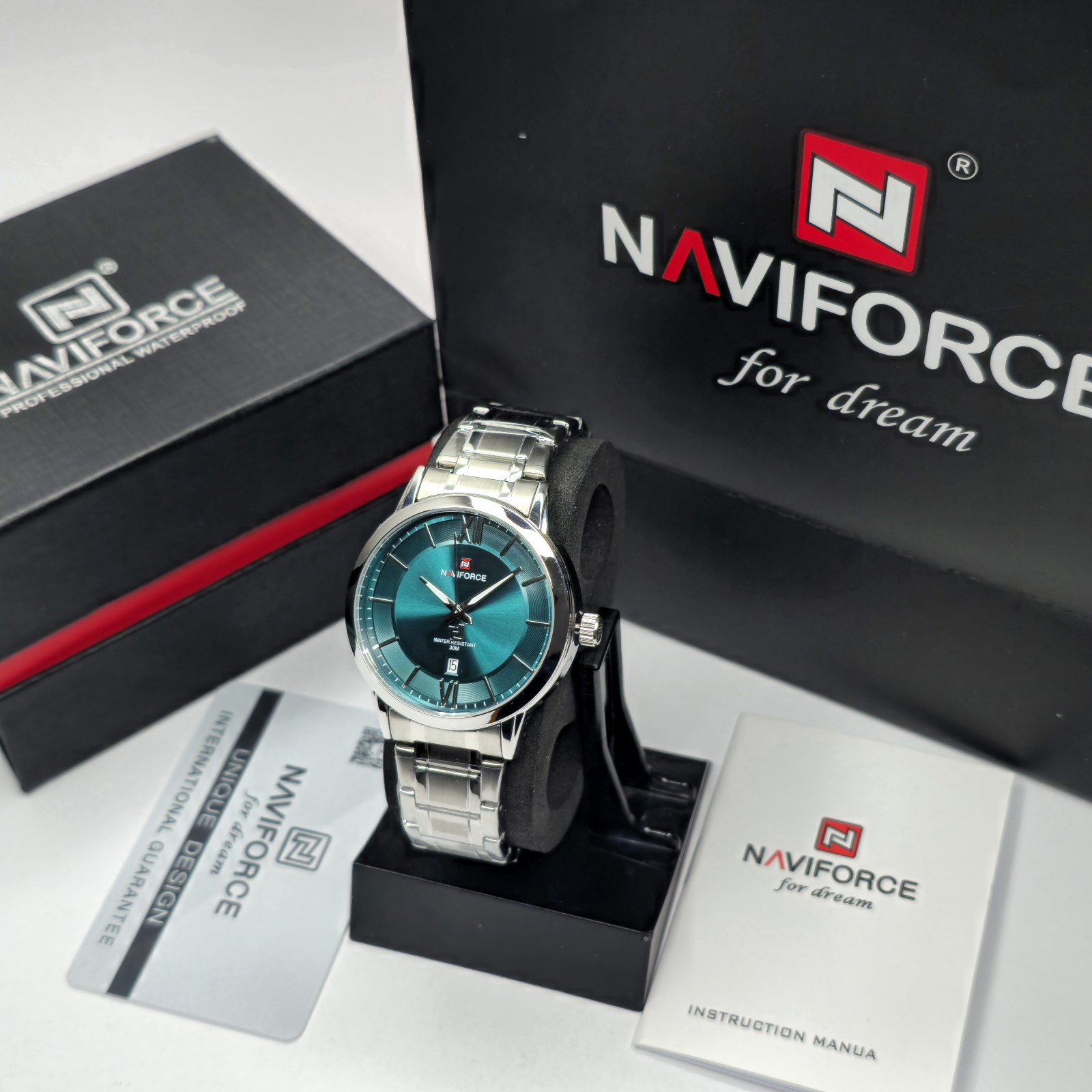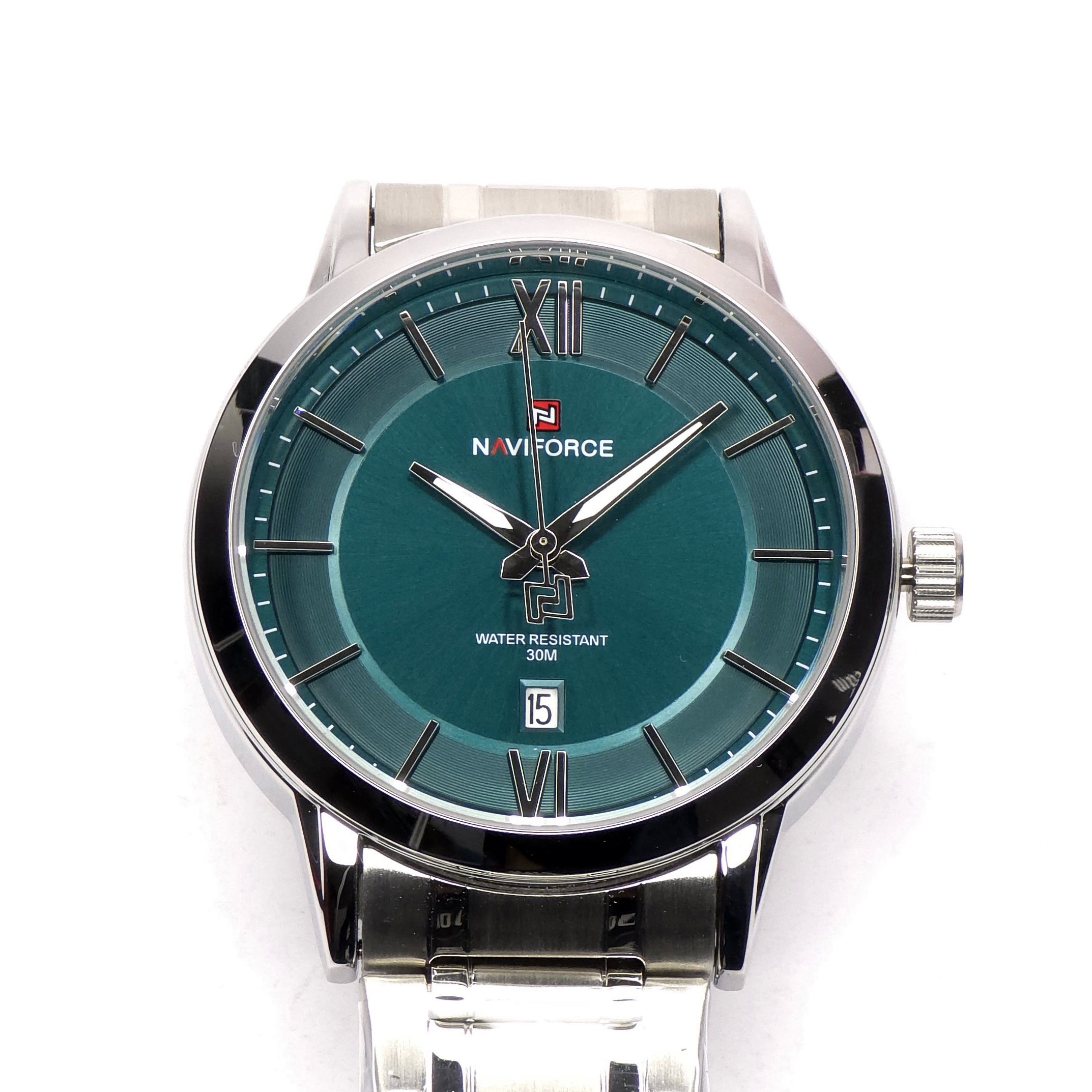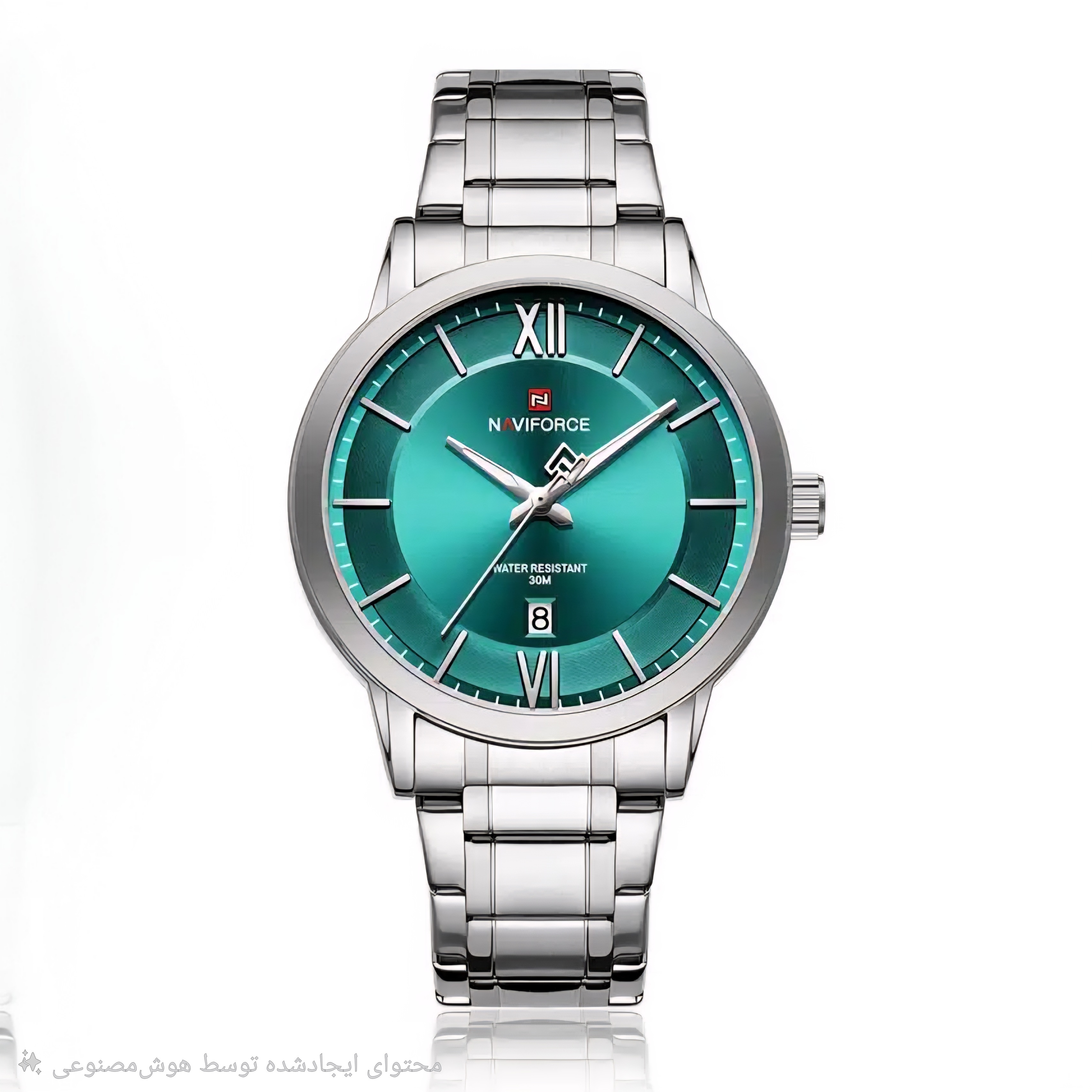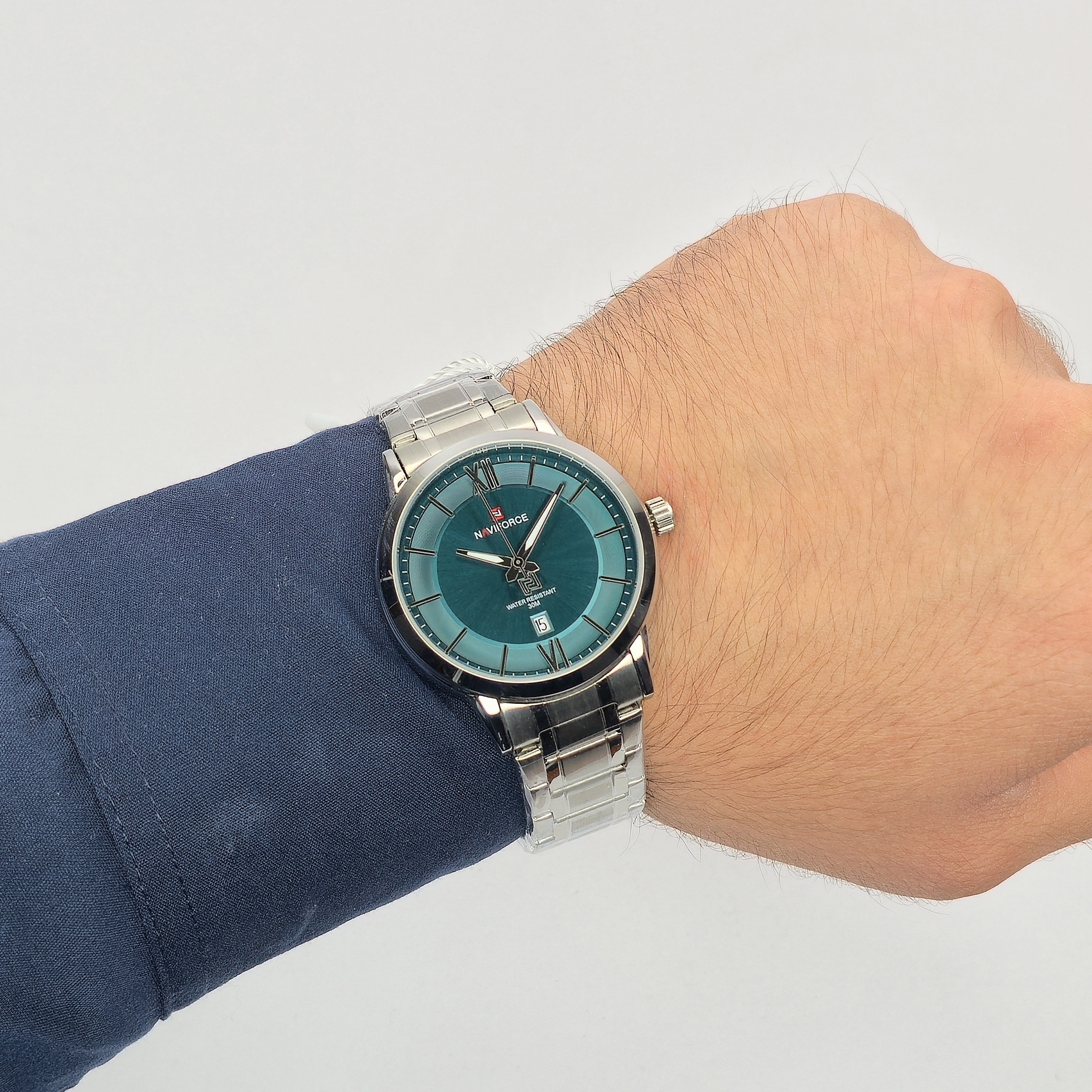 ساعت مچی مردانه Naviforce مدل NF9254 جلوهای از سادگی و وقار در کنار کیفیت ساخت بالاست. طراحی رسمی و رنگ منحصربهفرد صفحهی سبز-آبی در ترکیب با بند استیل ضدزنگ نقرهای، ظاهری جذاب و خاص ایجاد کرده که برای استایلهای رسمی و روزمره کاملاً مناسب است.قاب مقاوم از آلیاژ باکیفیت و شیشهی معدنی ضدخش، دوام بالایی برای استفادهی طولانیمدت فراهم میکند. این مدل به موتور کوارتز دقیق مجهز است و نمایشگر تاریخ آن، جلوهای کاربردی به طراحی کلاسیک ساعت میدهد. همچنین مقاومت در برابر آب تا ۳ اتمسفر (3ATM) باعث میشود در برابر پاشش آب یا رطوبت روزمره، خیالتان راحت باشد.ترکیب هماهنگ رنگ، طراحی ساده و وزن متعادل، باعث شده مدل NF9254 یکی از انتخابهای محبوب میان آقایان خوشاستایل باشد؛ ساعتی که ظرافت و استحکام را در قالبی رسمی و شیک به نمایش میگذارد.