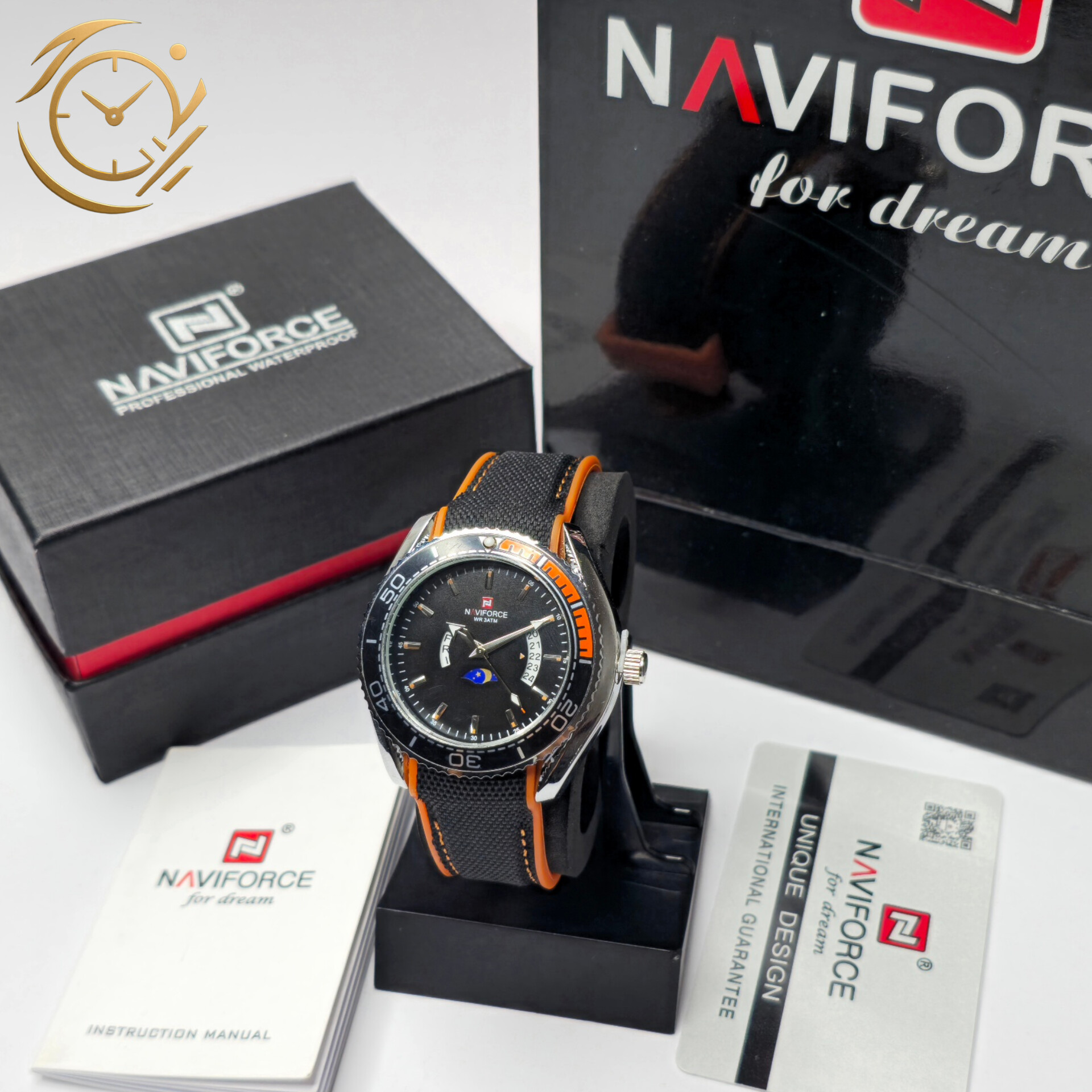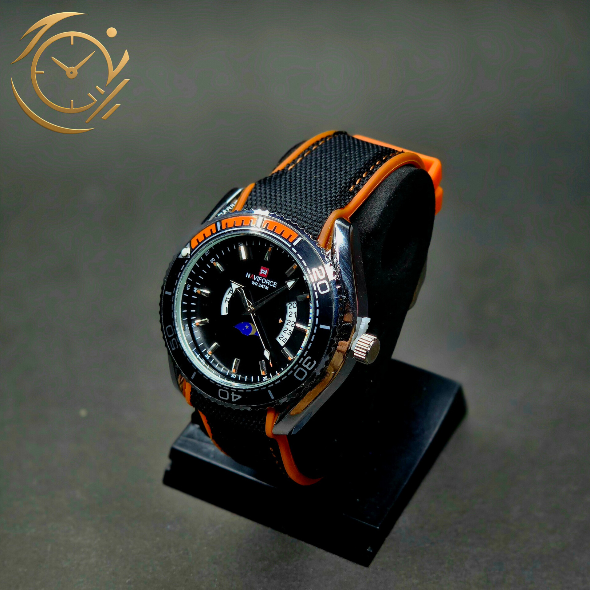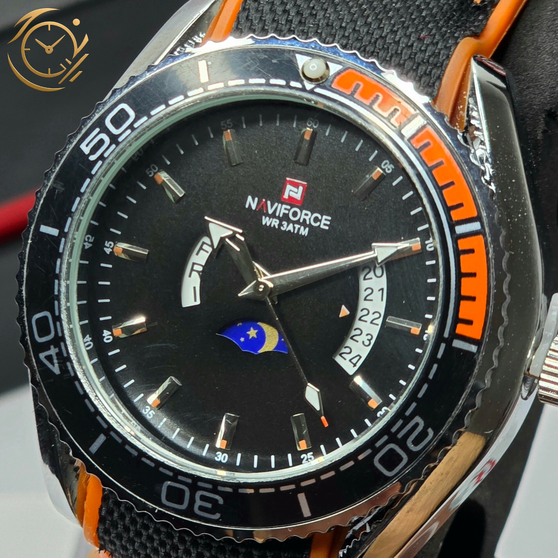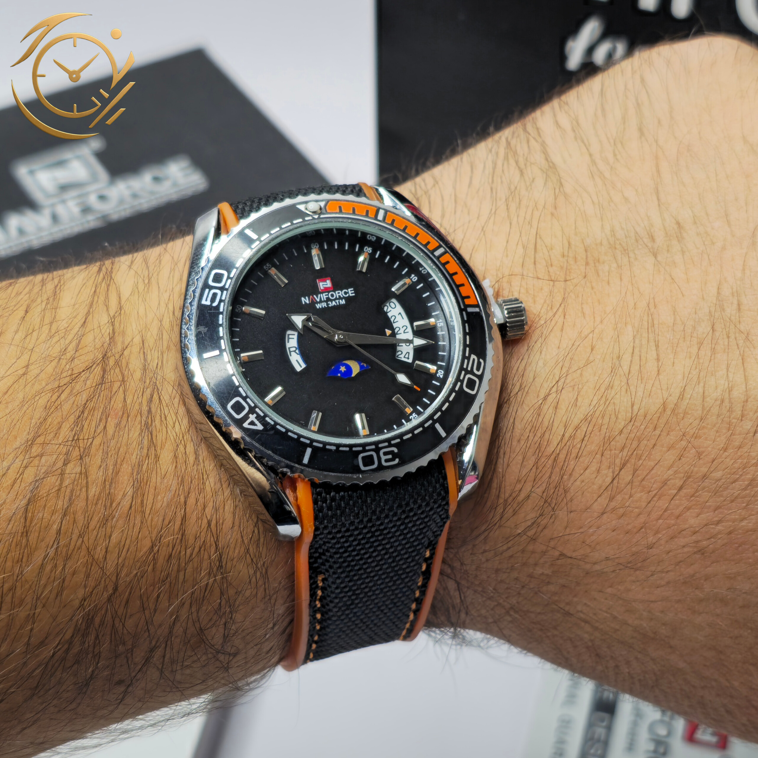 ساعت مچی مردانه Naviforce مدل NF9724 | بند پلاستیکی نارنجی و برزنتی سفید، صفحه مشکی، فول تایم و بزل گردان | اسپرت