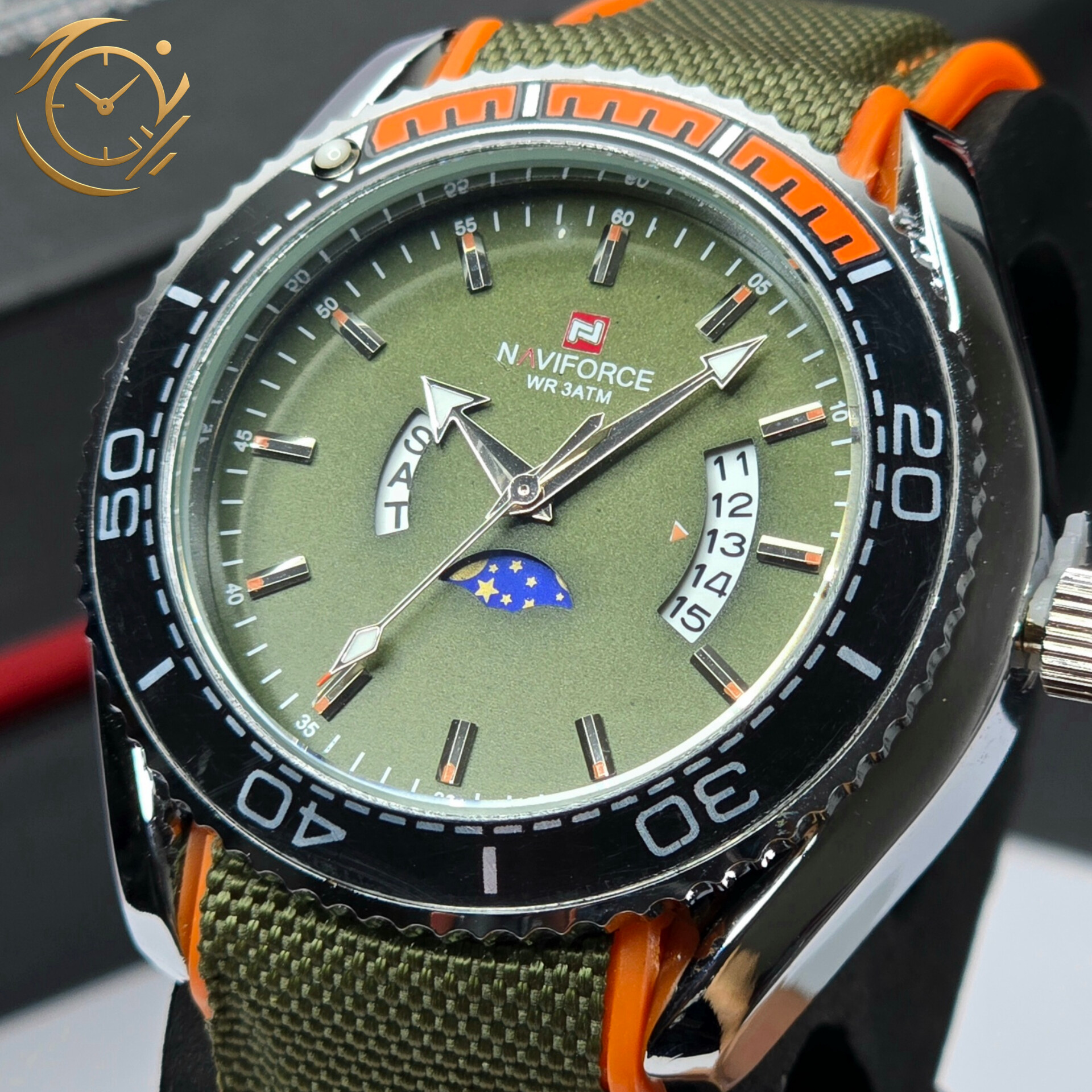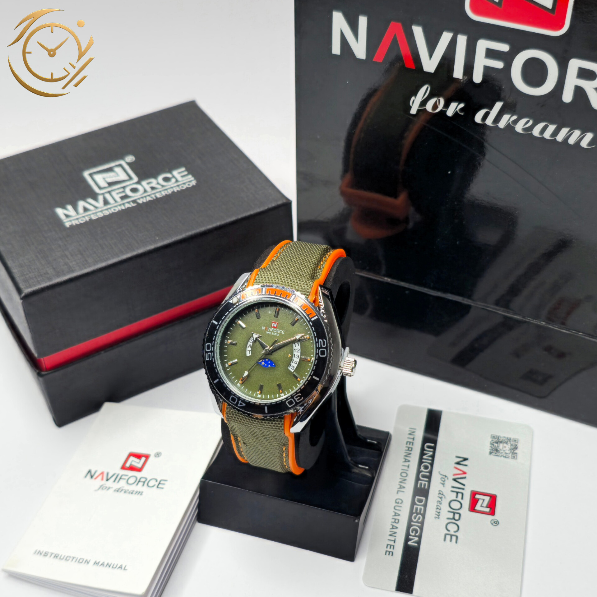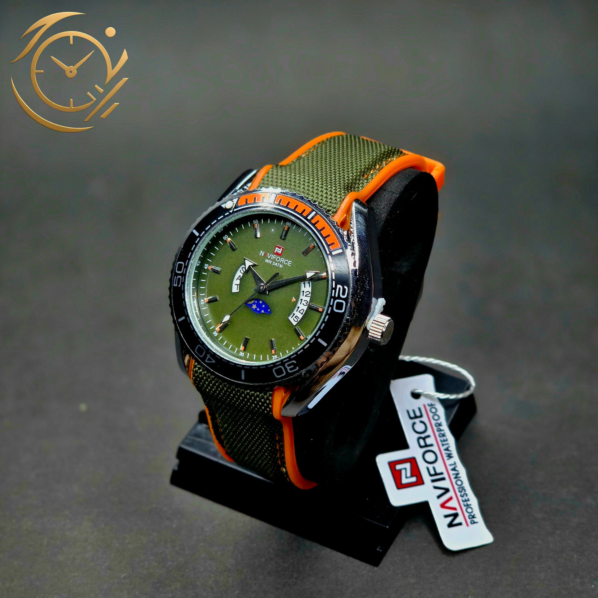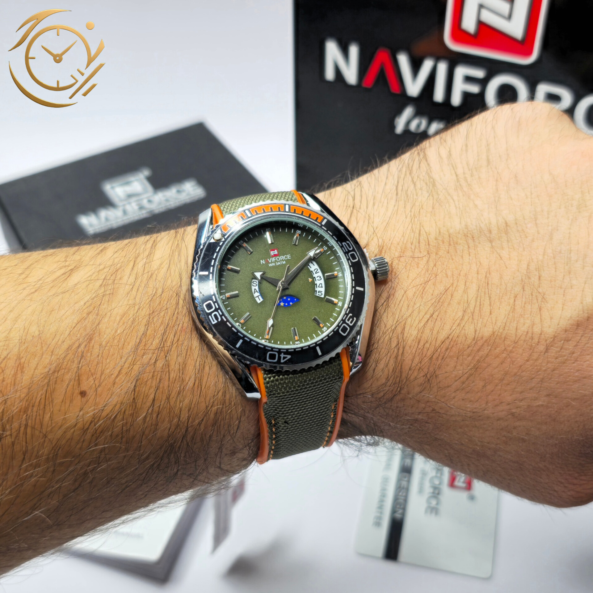 ساعت مچی مردانه Naviforce مدل NF9724 | بند پلاستیکی نارنجی و برزنتی سفید، صفحه مشکی، فول تایم و بزل گردان | اسپرت
