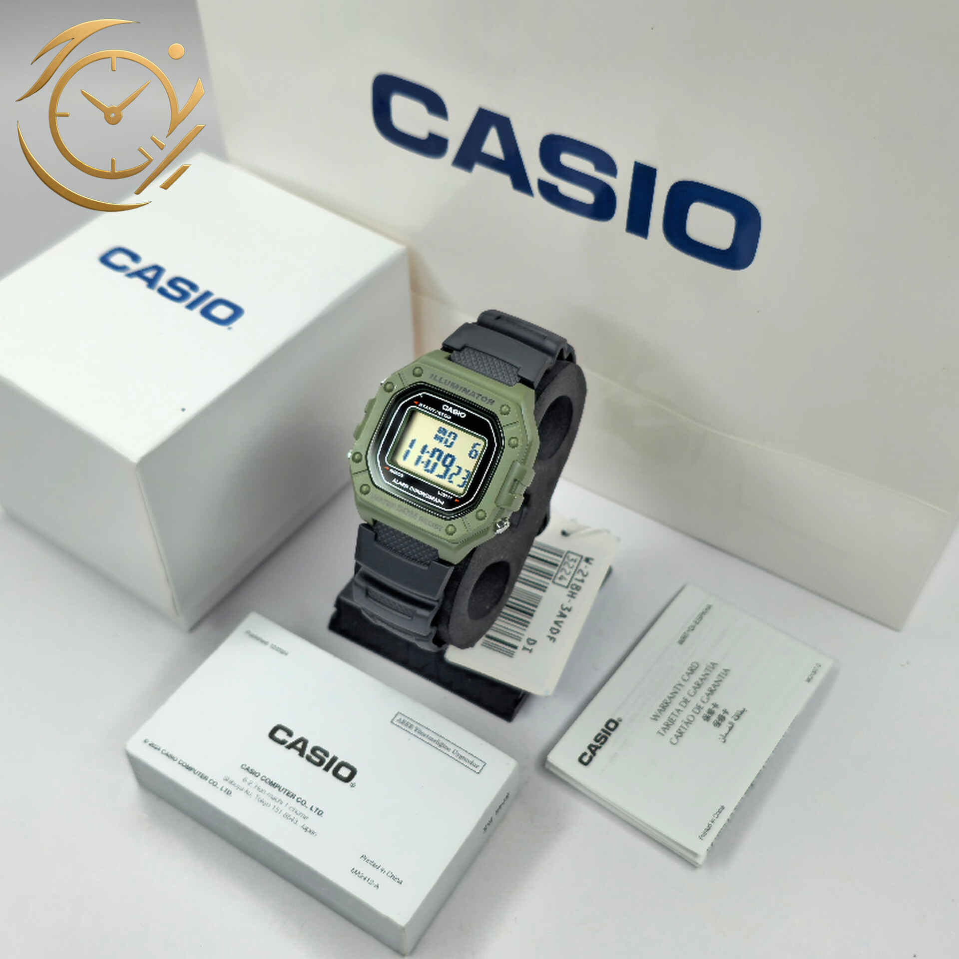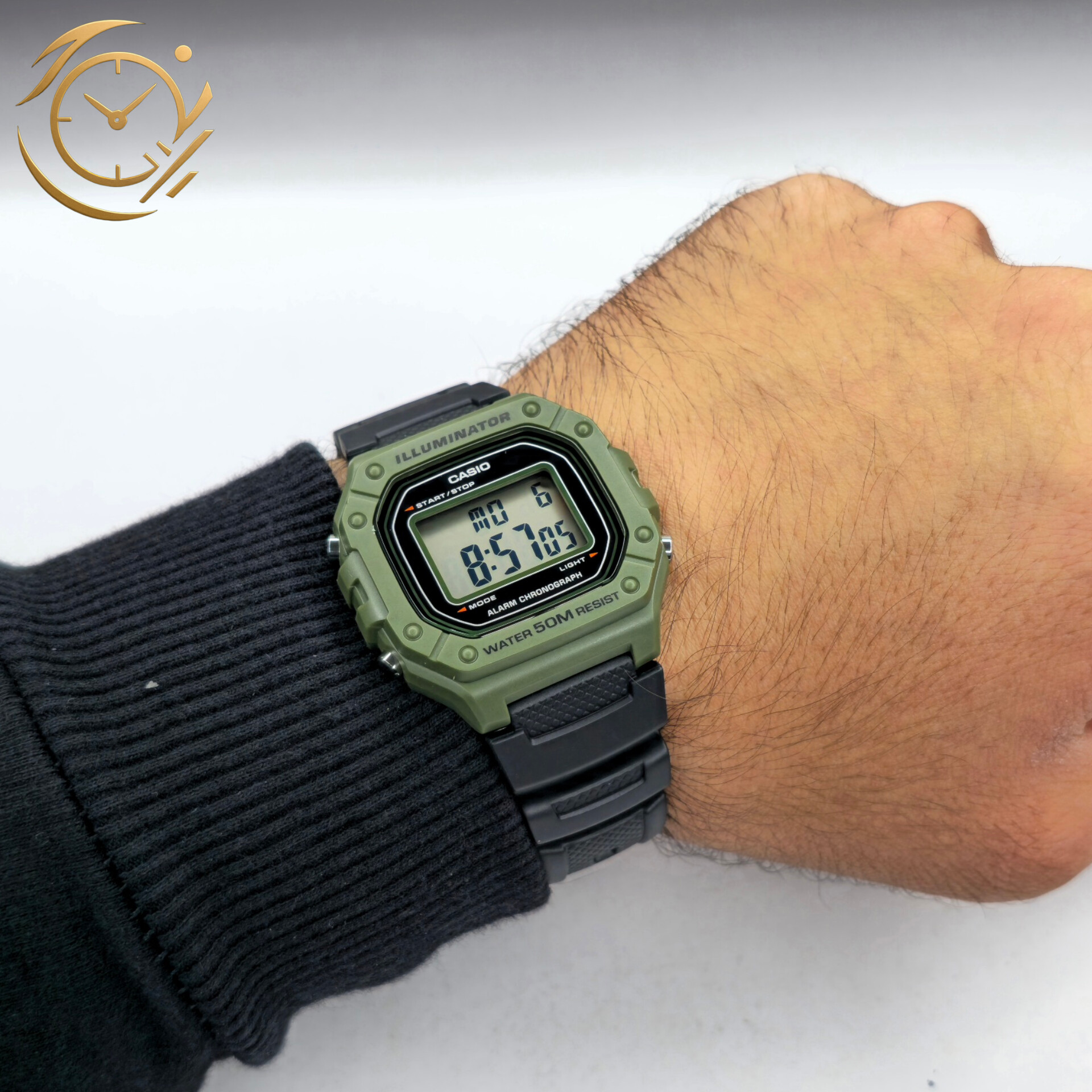 ساعت مچی Casio مدل W-218H-3AV | بند رزینی مشکی، قاب سبز ارتشی، دیجیتال | اسپرت و مقاوم